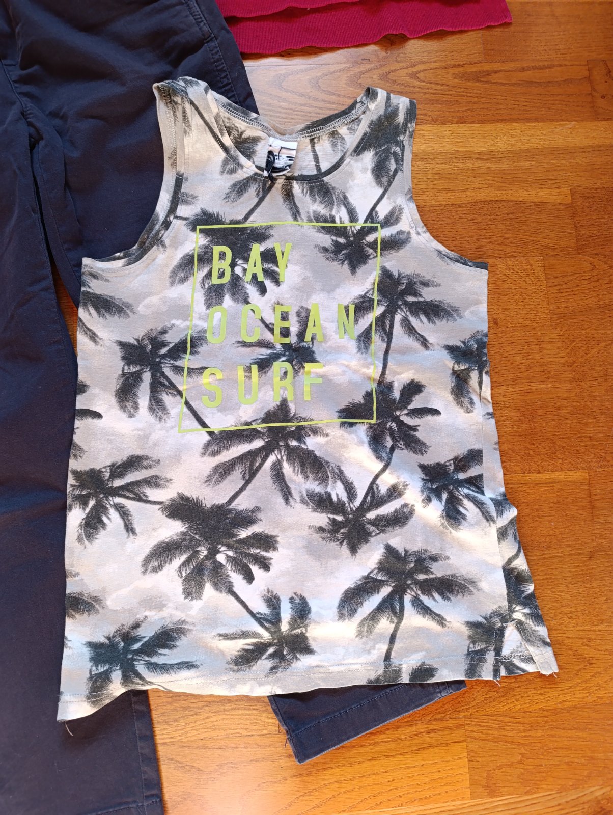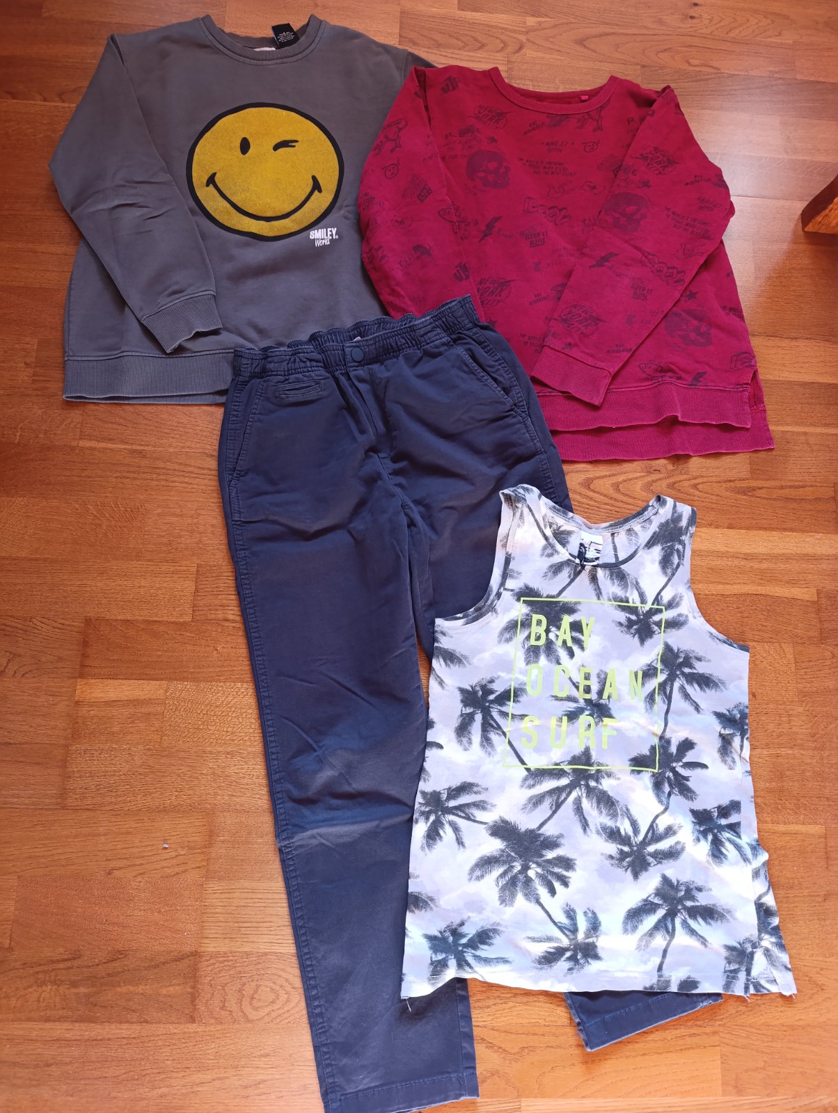 Veľkosť 146/152 Balík obsahuje: 5x tričká s dlhým rukávom, 3x tielka, 1x mikina, 1x tepláky, 1x šortky, 1x elegantné nohavice ( písané veľkosť 34) . Cena za všetko 10 eur
