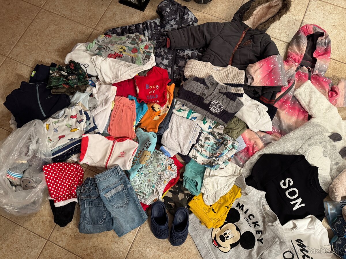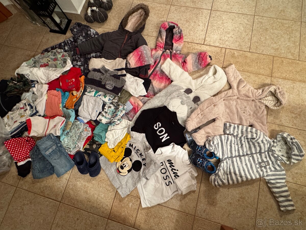 Veci sú nové, nosené bolo len: overal aMickey Mouse mikina na zips, sú tam veci s visačkou a ostatné veci bez visačky sú len opraté. Všetko je vo veľkosti 74. 1x súprava - tričko a tepláky (nové) ...
