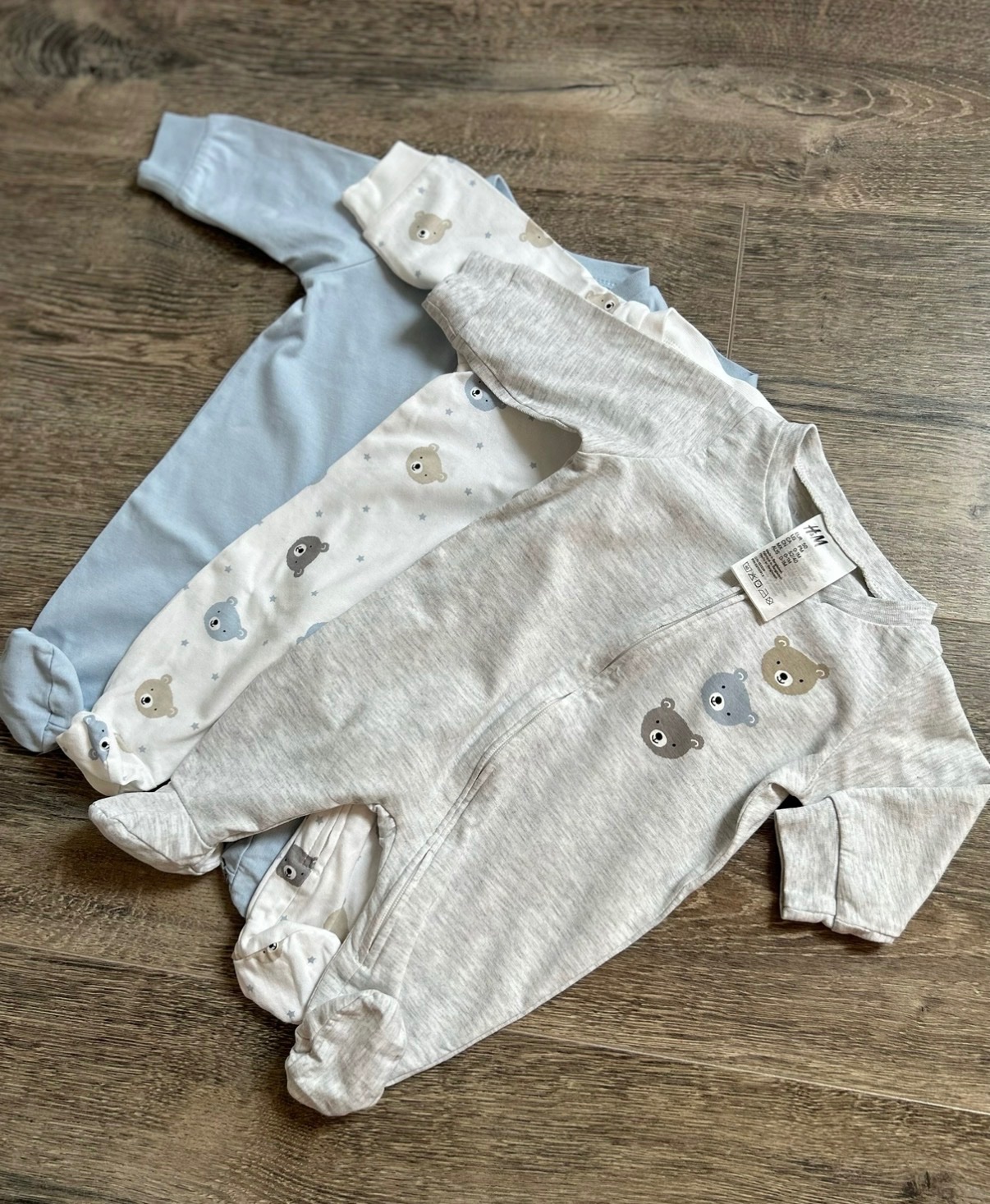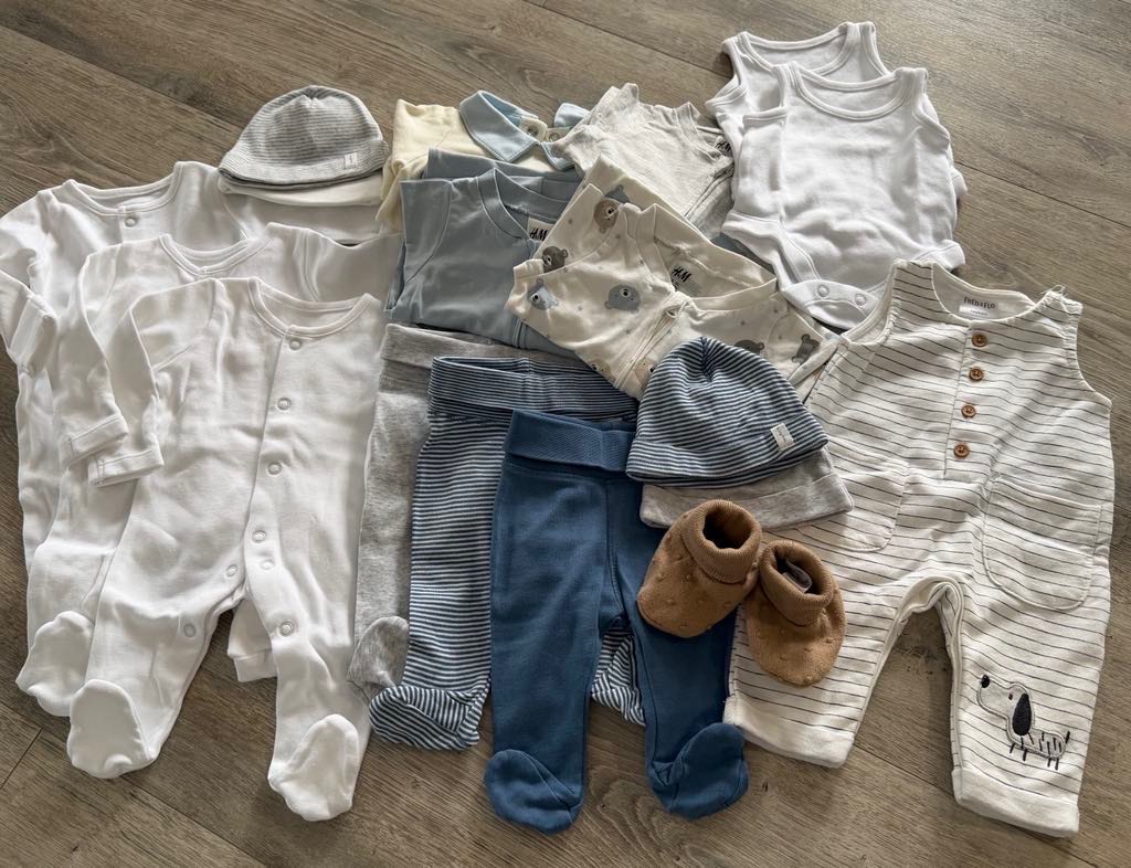 Posúvam balík pblečenia pre novorodenca. Veľkosť všetkého je 50 len modrá pásikavá a sivá čiapočka sú 56 a hnedé papučky 3-6mes.