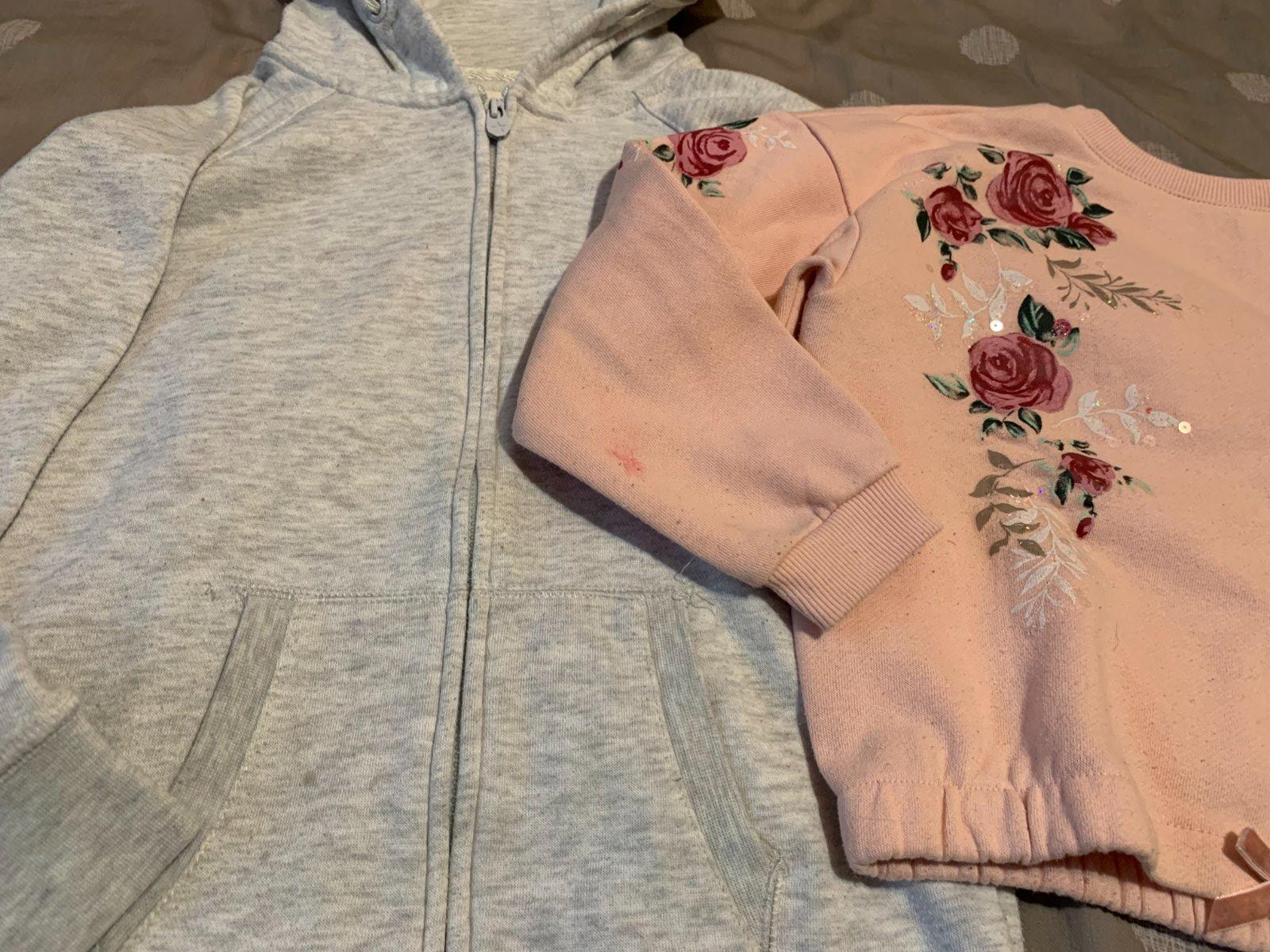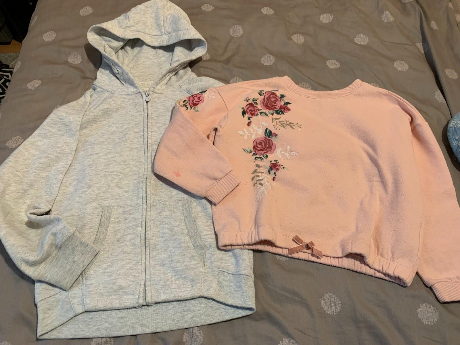 2x mikina, sivá žmolky ružová fliačky - viď. foto, ale na doma ešte určite poslúžia. Veľkosť 128.