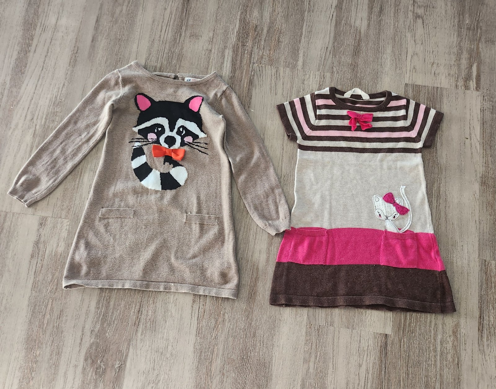 Veľkosť 110-116,sú teplejšie,takže vhodné na jar,jeseň.Šaty s krátkymi rukávmi má vracká.Cena spolu