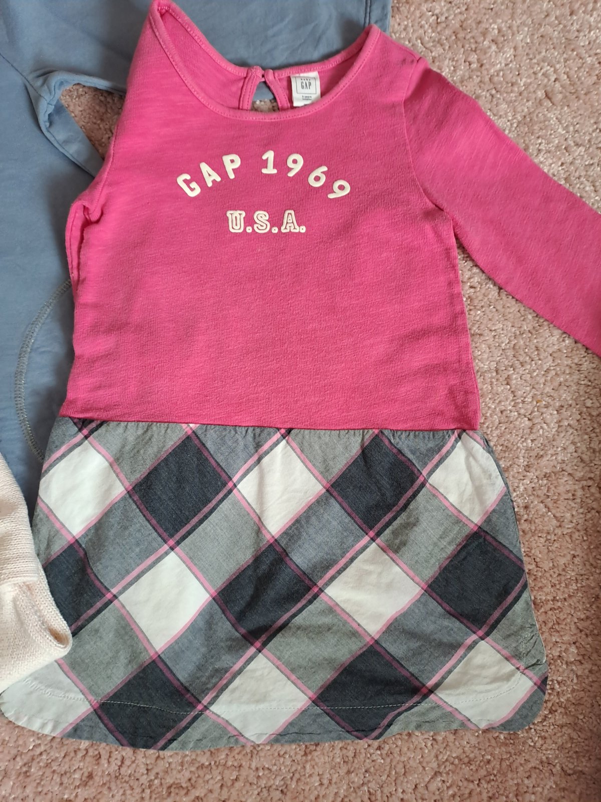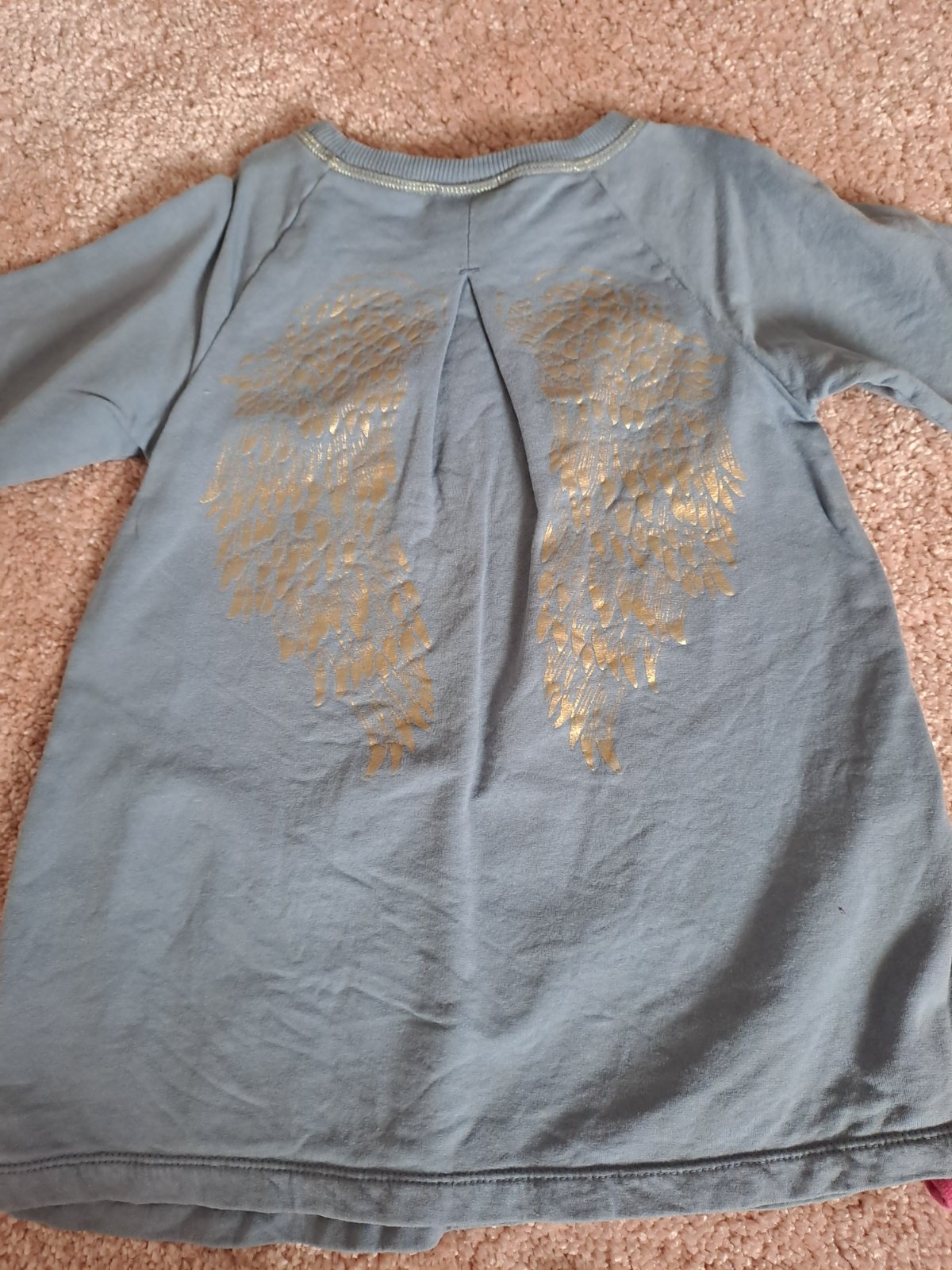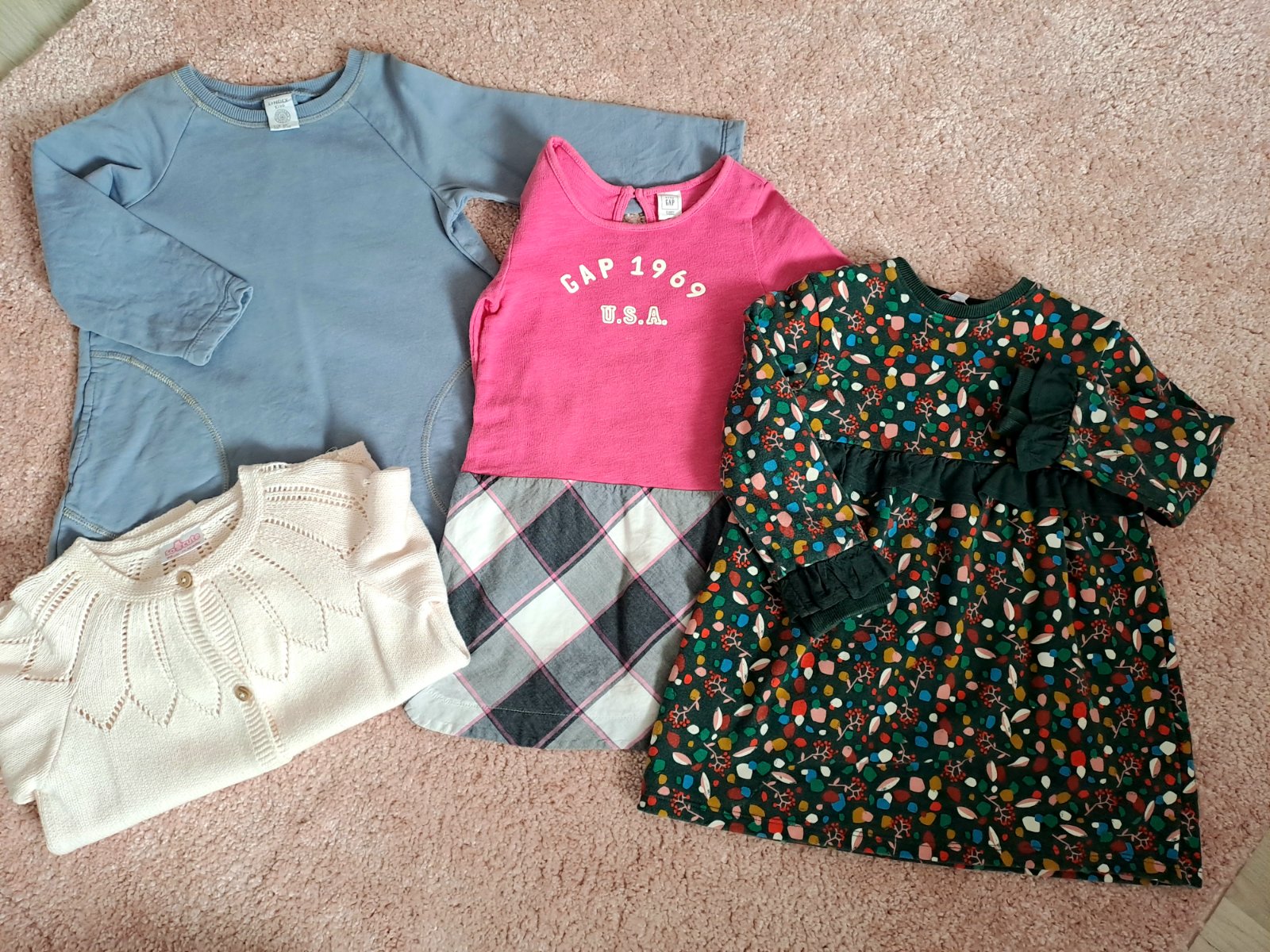 Pekné oblečko pre dievčatko. Bez poškodenia. 1x tunika Lindex (vzadu zlatá potlač krídel - krásna), 1x šatky Boboli, 1x šatky GAP, 1x marhuľkový svetrík So cute. Veľ. 98