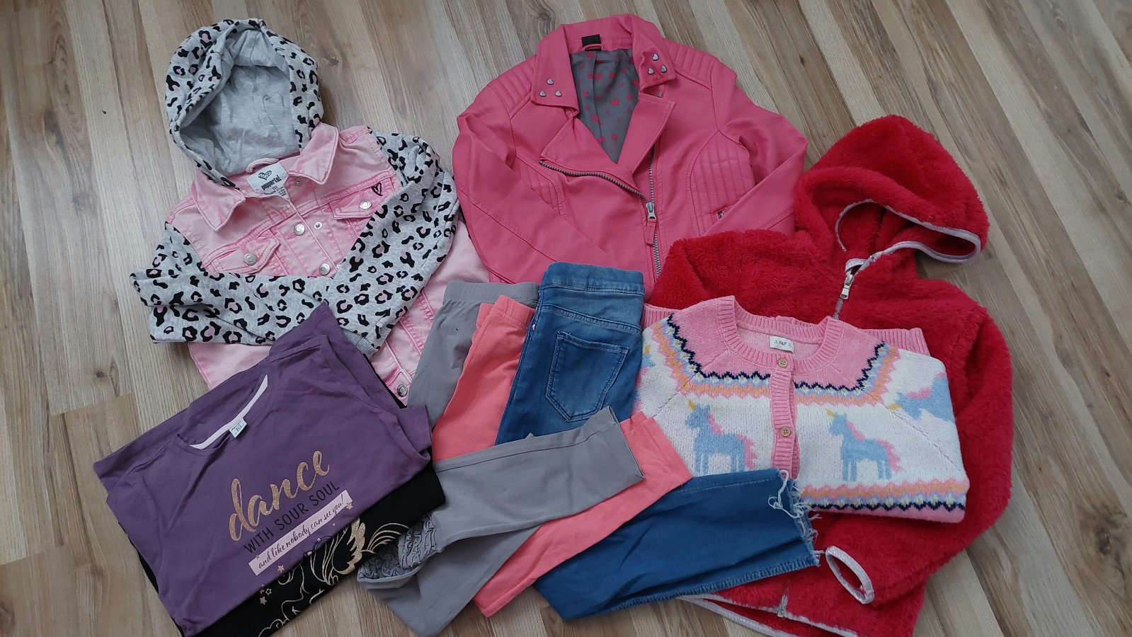 Perfektný stav bez chybičky, ružová/ leopard bunda z Lidla, koženka Kik, chlpatka zo Sportisima, legíny sivé Lindex, ružové Takko, rifle H&M, tričká Takko, svetrík F&F. Všetko kvalitné bezchybné kúsky.