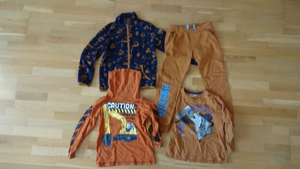 Predám 4 kusy detského oblečenia veľkosti 122 na snímke - mikina, tepláky, rolák a tričko s dlhým rukávom Nosené mojim synom - krásny setík bez chýb.