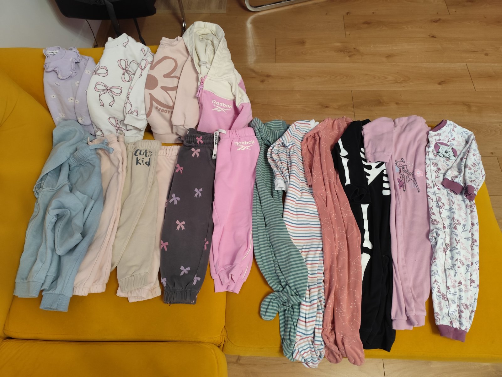 Znacky rozne,vsetko v peknom stave akurat body su nosenejsie a na dvoch je flak.Veci typu body,leginy,saty,svetre,mikina,tricko,bunda