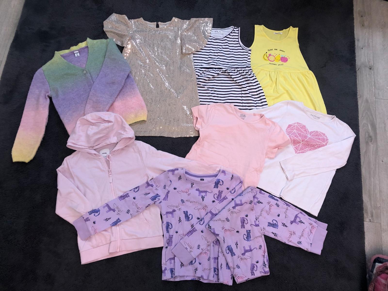 Ponúkam na predaj balik oblečenia pre dievcatko velkost 122, balik obsahuje: pyzamo s dlhým rukávom, mikina s kapucňou, tricko dlhy a tricko kratky rukav, 2x saty bez rukáva, 1x trblietave saty, svetrik na gombíky