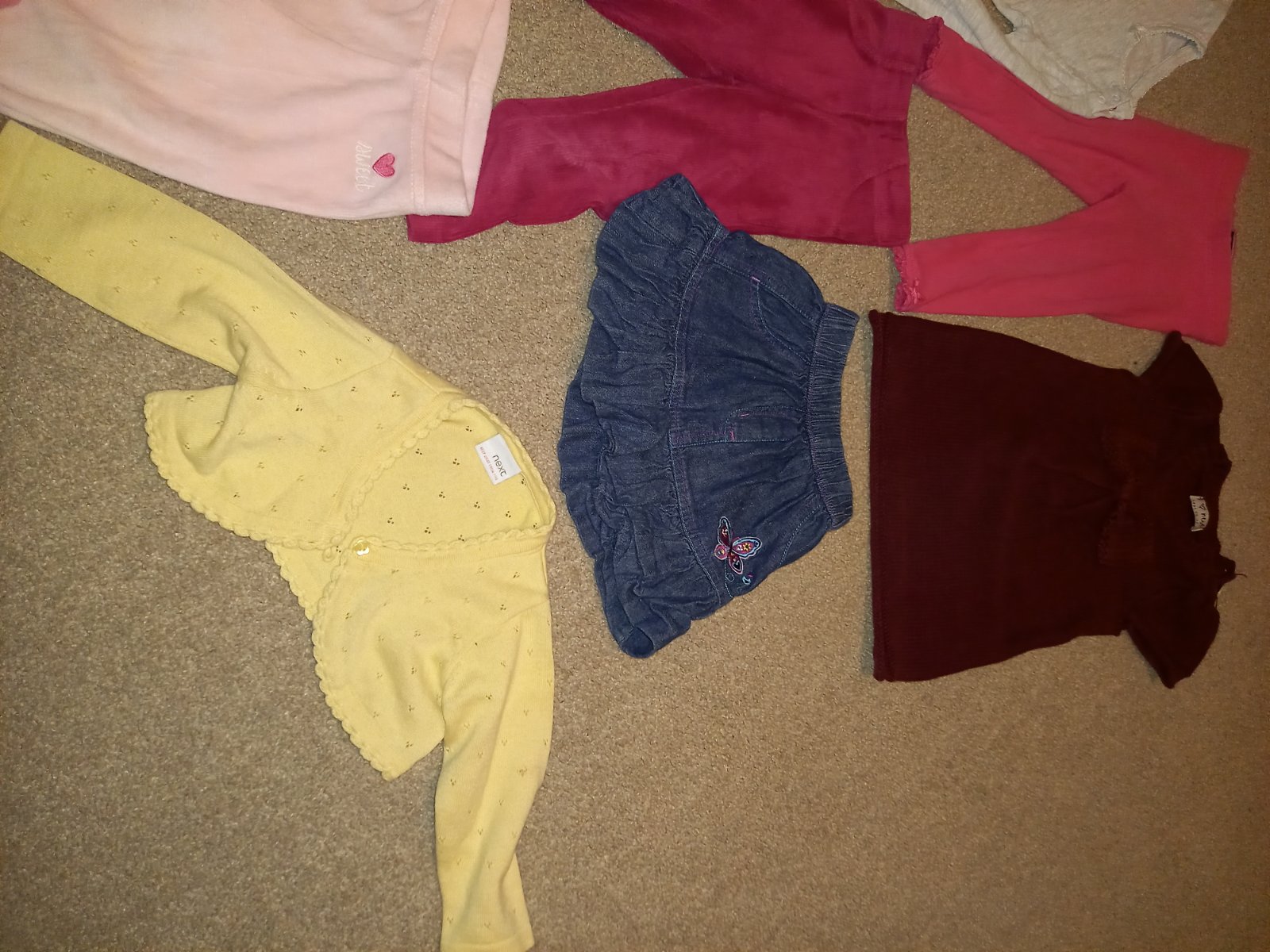 Predám balík oblečenia pre dievča 9-12 mesiacov. Oblečenie je bez poškodení len na žltom svetríku je fľak vid na fotke.