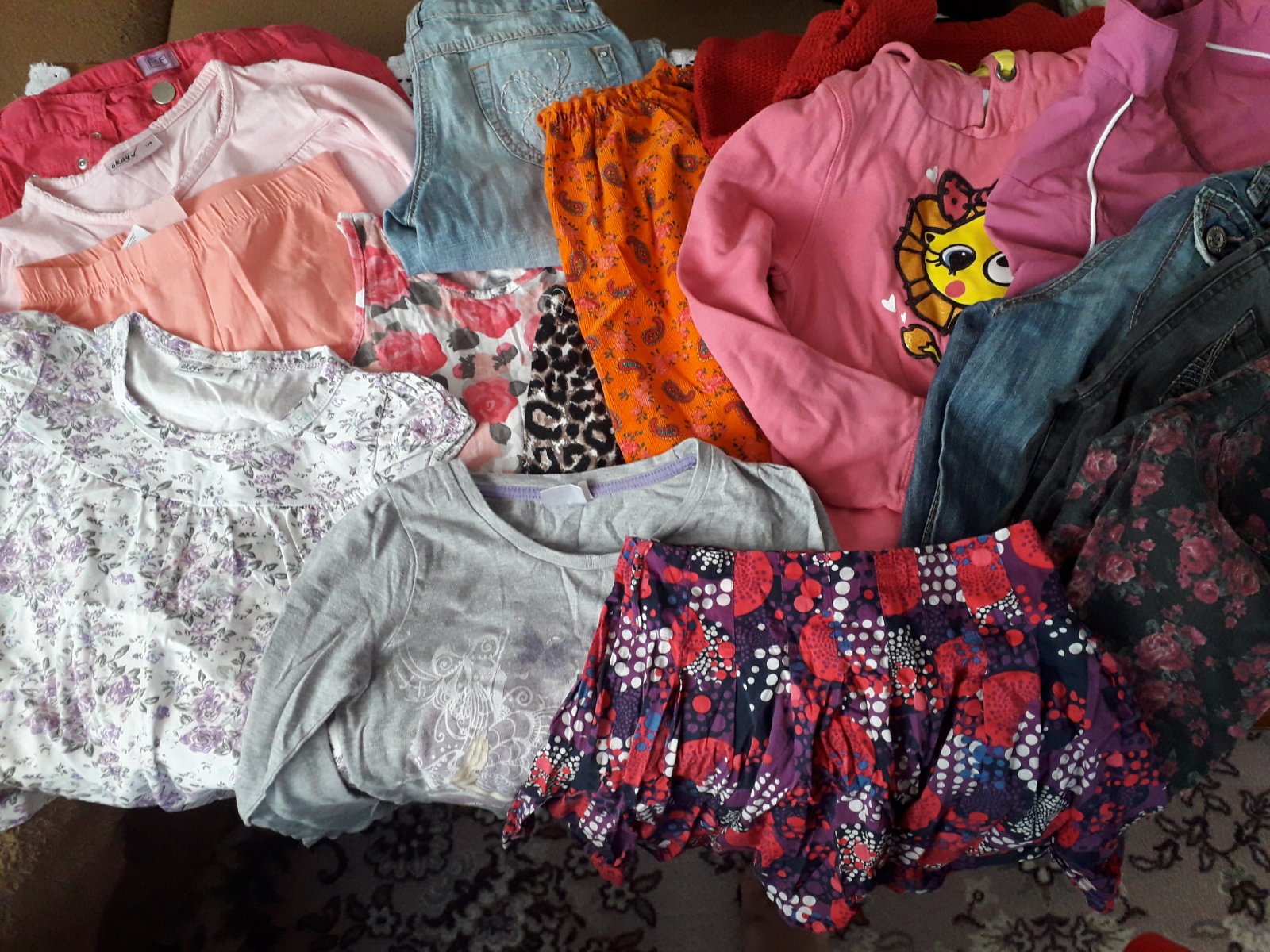 Predam balik obsahuje 3 nohavice,mikinu,bundu,saty letne a na jesen,2 leginy,2 letne nohavice,suknu,pulovrik,2 tricka s dlhym rukavom,