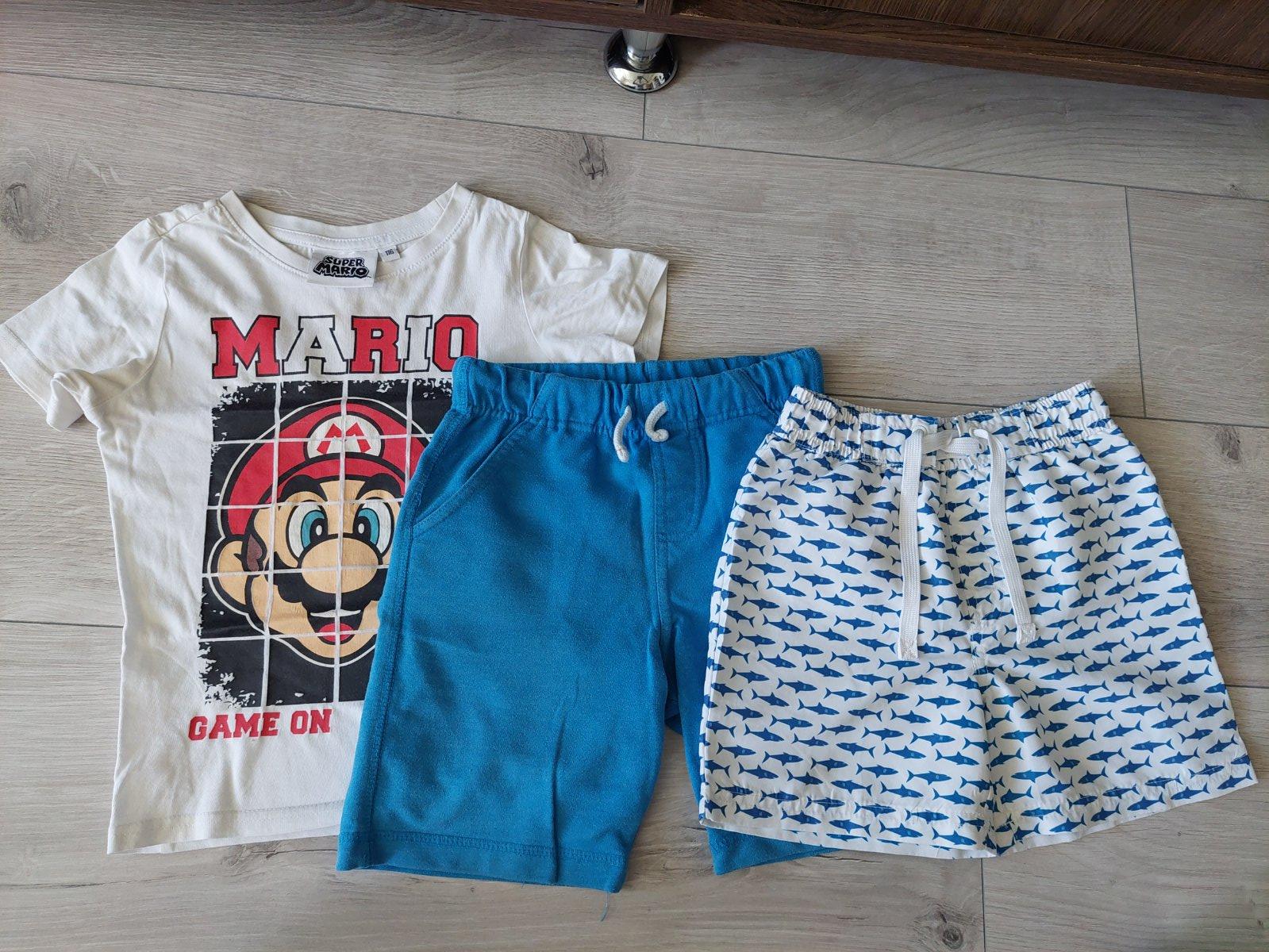 Tričko vo veľkosti 116. Značka Super Mario. Plavky s vnútornou sieťkou vo veľkosti 110/116. Značka Lupilu. Kraťasy modré vo veľkosti 116. Značka F&F.