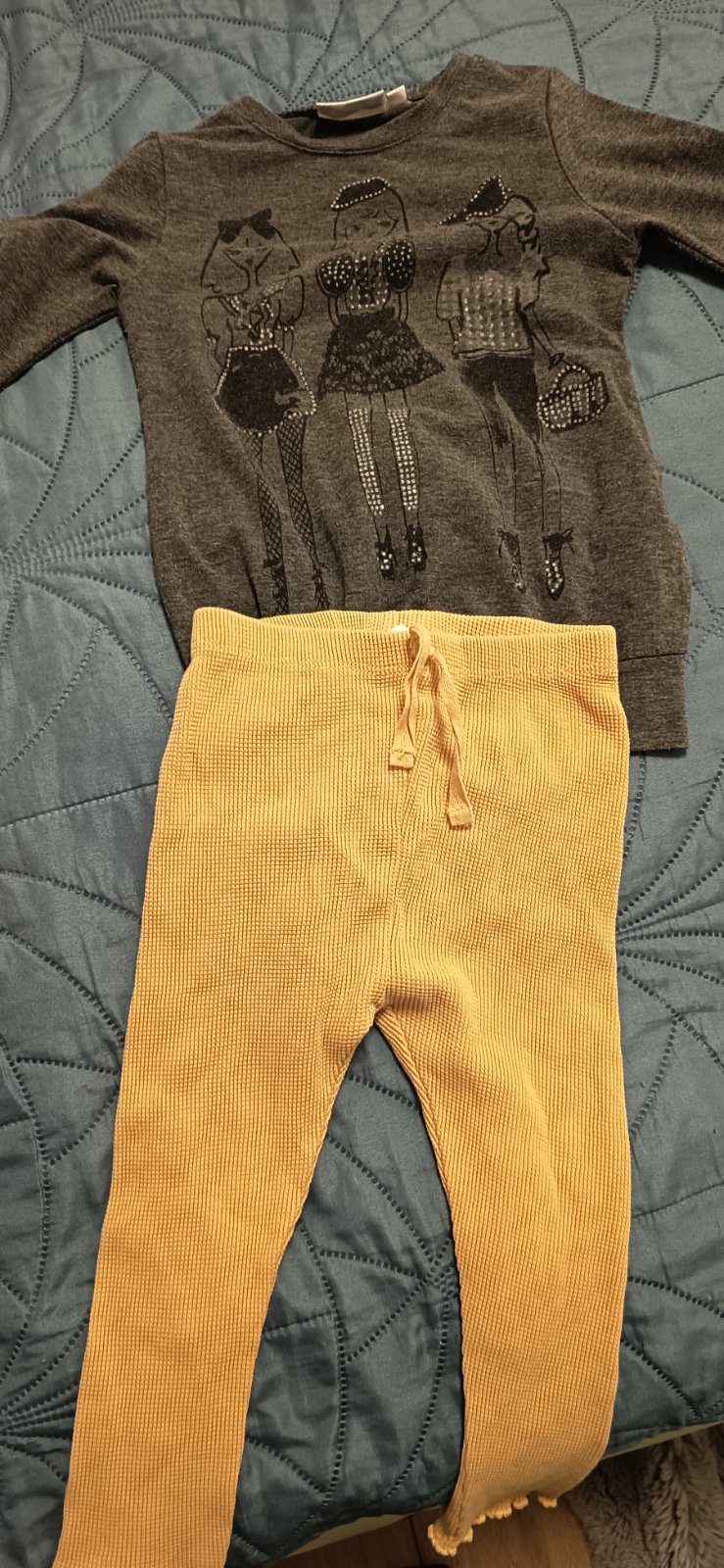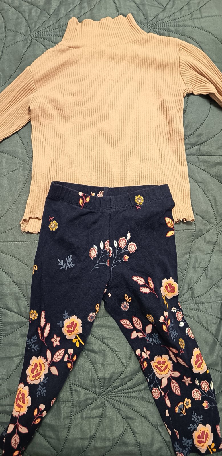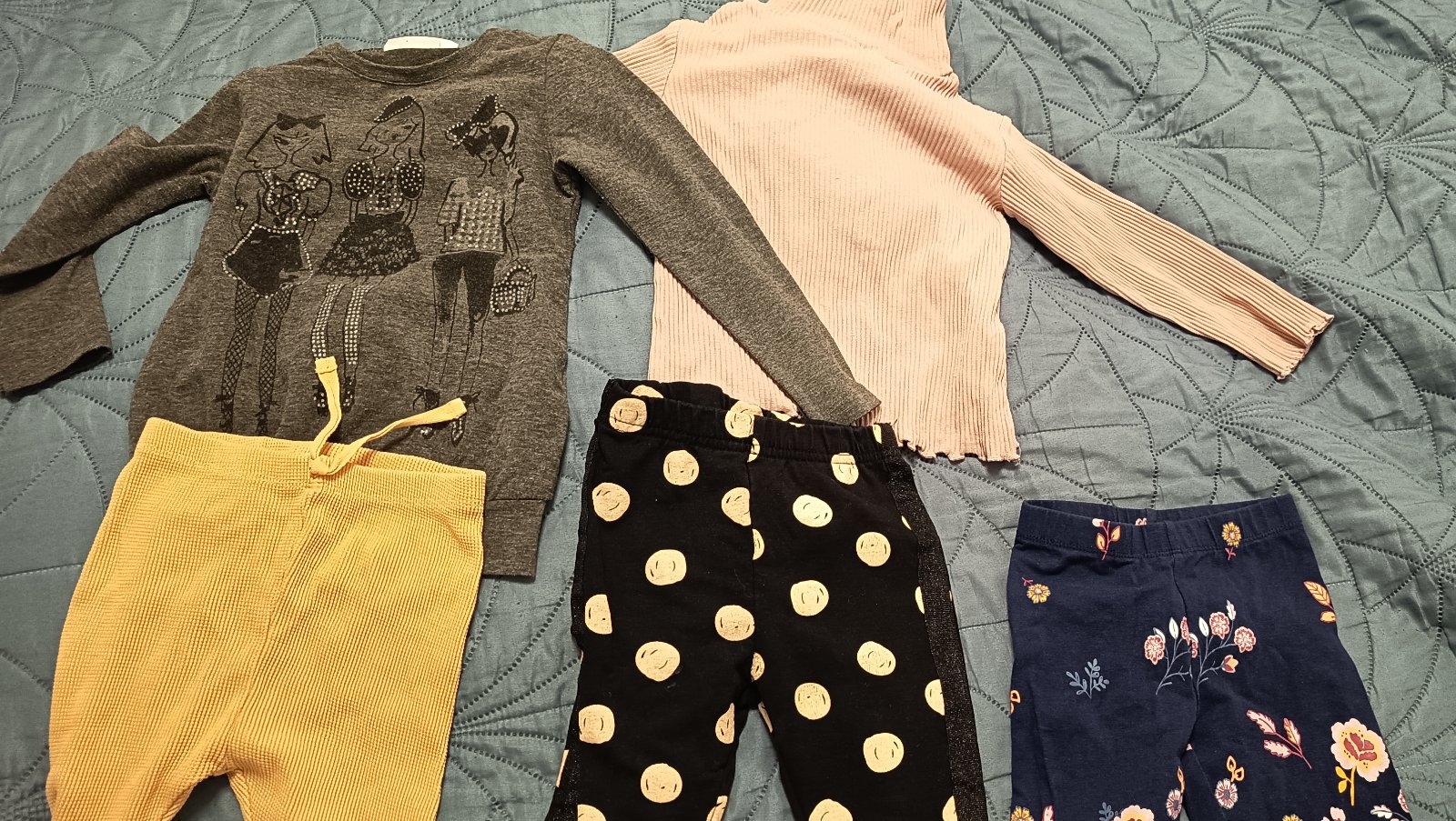 Veľmi dobrý stav, všetko veľkosť 3T. Šaty nosene bez poškodenia, košeľa ako nová, tričko modré nosene bez poškodenia, čierny rolak nenoseny len otrhnuta visačka, na leginkach vidiet pranie, mikink...