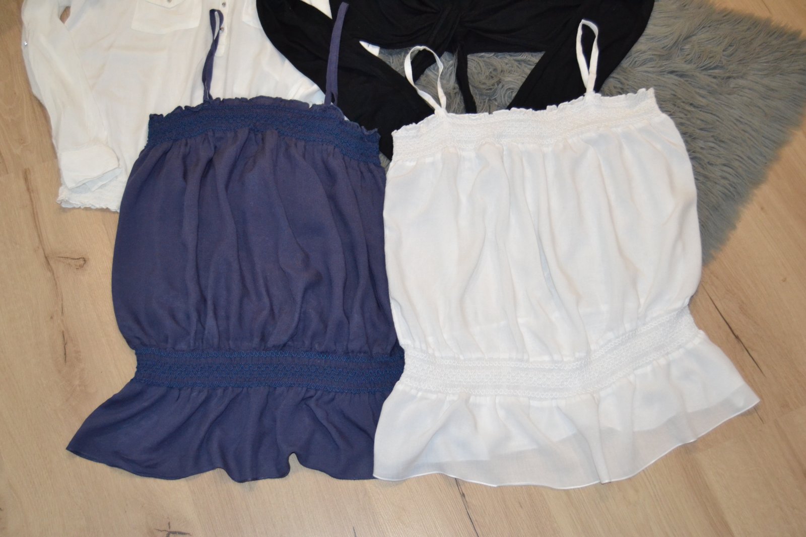 Balík dámskych elegantných blúzok zo strečového materiálu 4 ks/7e, veľkosť L, farebne čierna, biela, tmavomodrá. Málo nosené v top stave.
