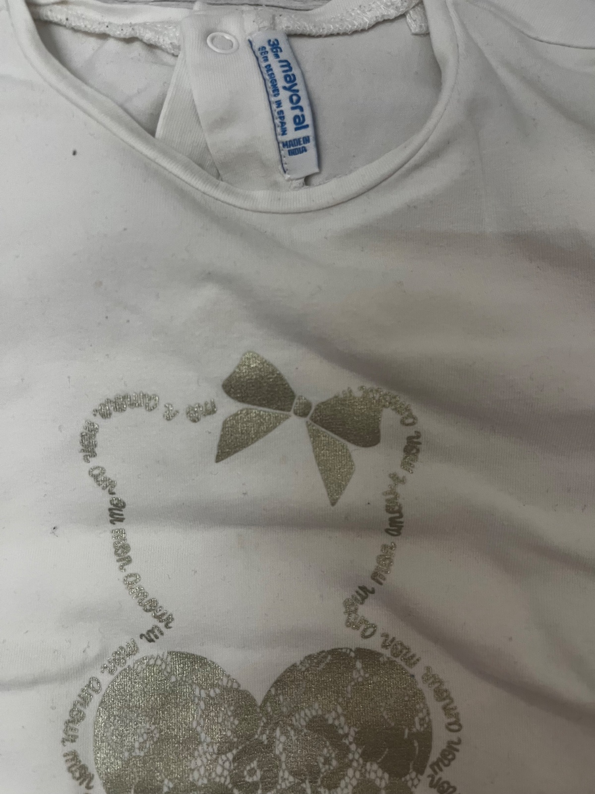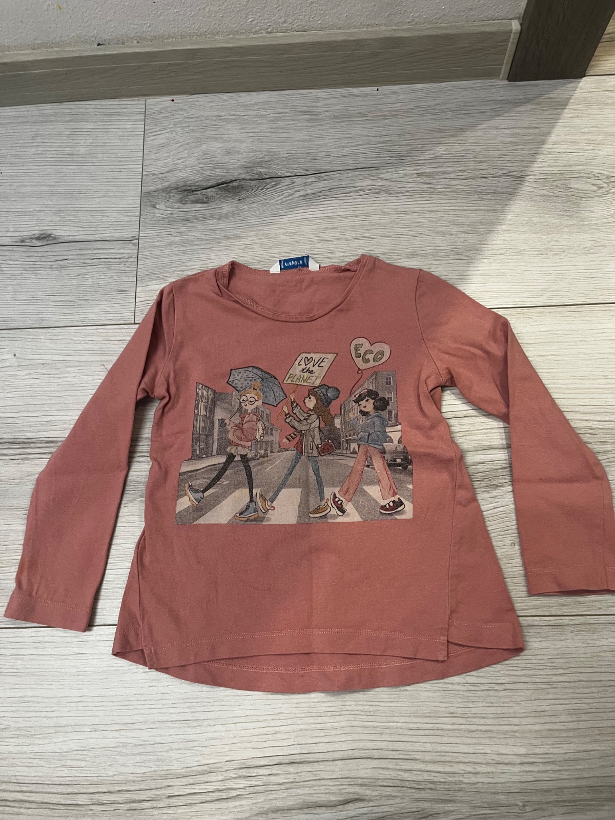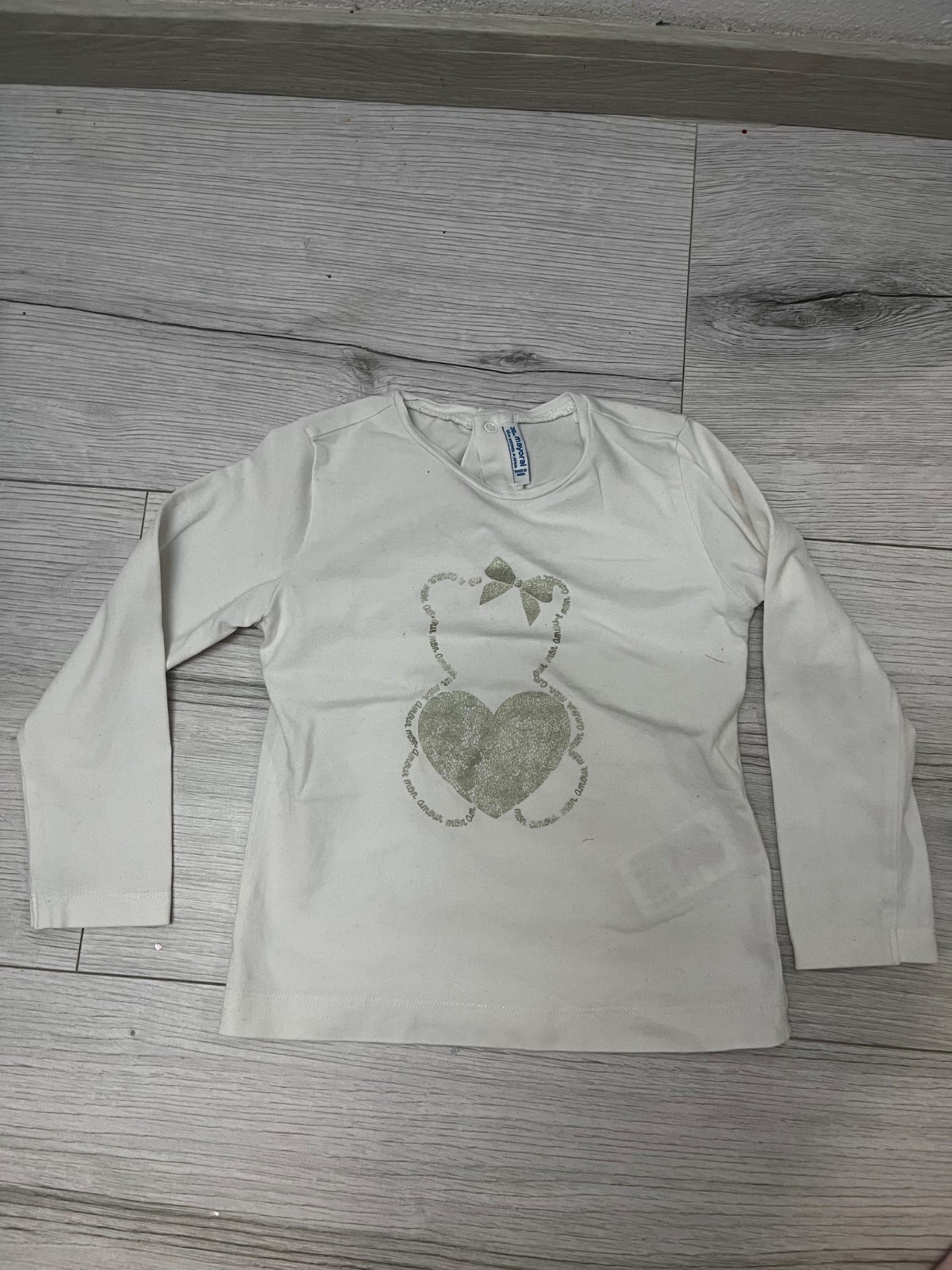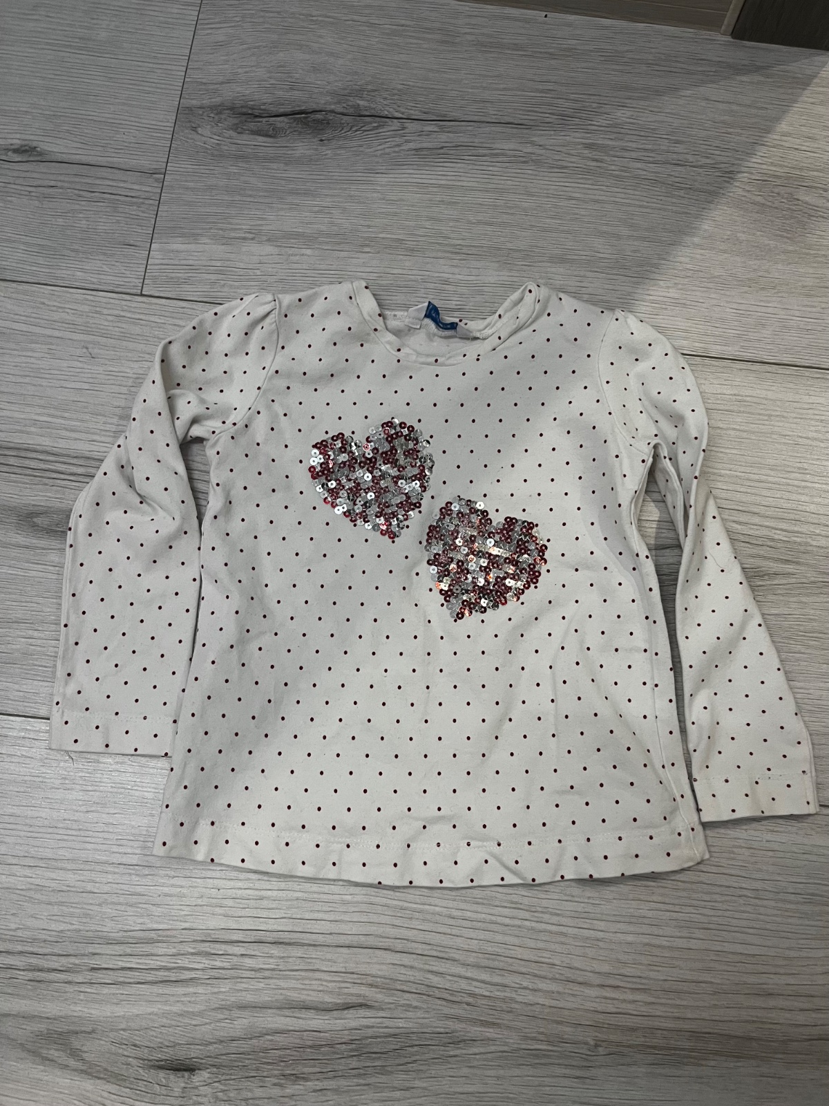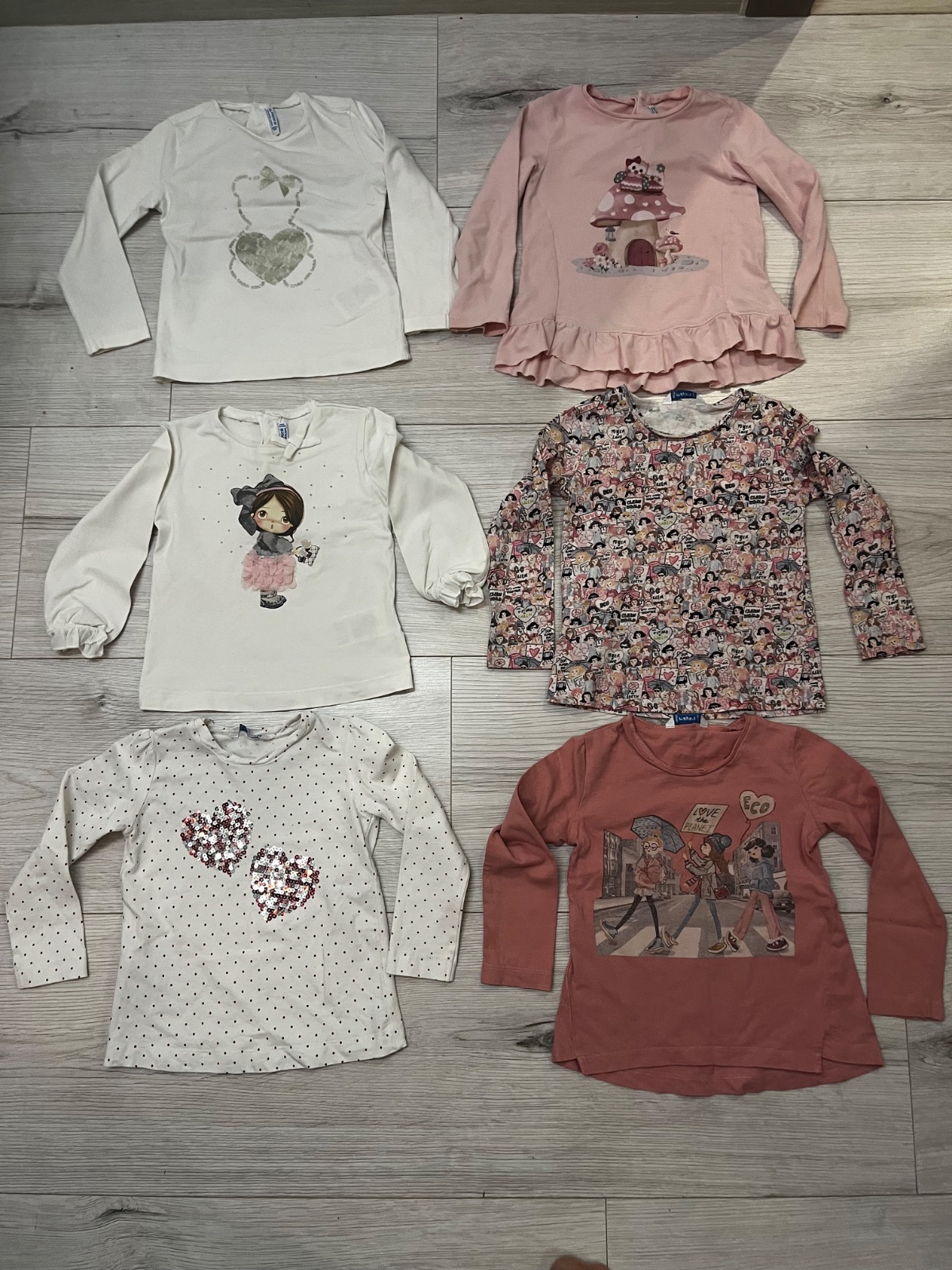 Predám balík dlhorukavovych topov vhodných do škôlky značky: Mayoral, veľkosť: 98. Na bielom tope s červenými bodkami sú červene flitriky mierne vysuchane.