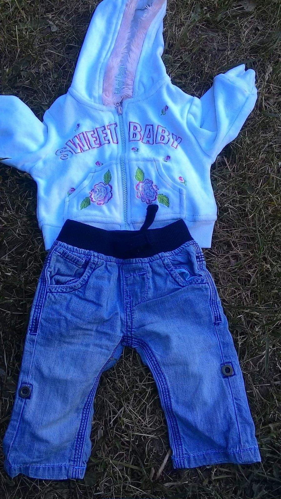 Riflicky f&f 1x oblecene, 2x oprate. Biela mikina s chlpatou kapucnou. Vyborny stav. Riflicky nositelne do cca 2 mesiacov. Mikina trochu dlhsie.