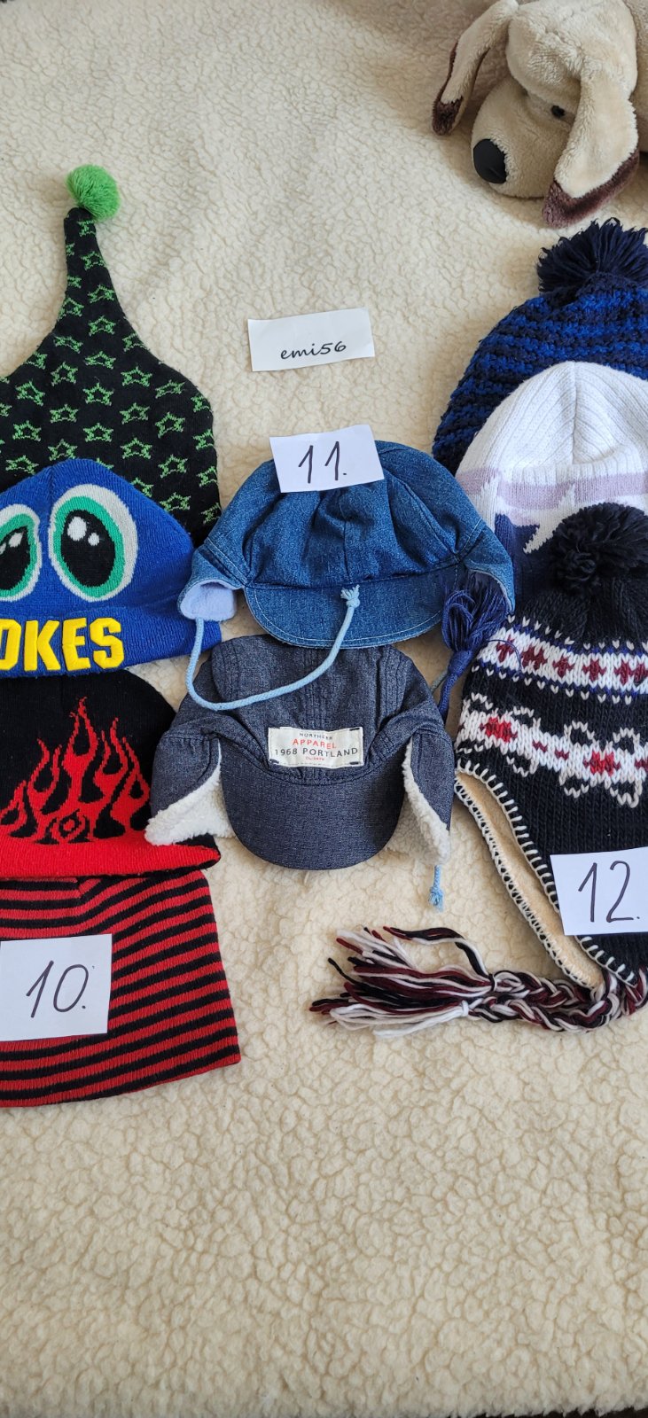 10. Pletené čiapky hrubšie resp. hrubé, štítky nie sú, veľkosť cca 54-56, pre 5-8 r.