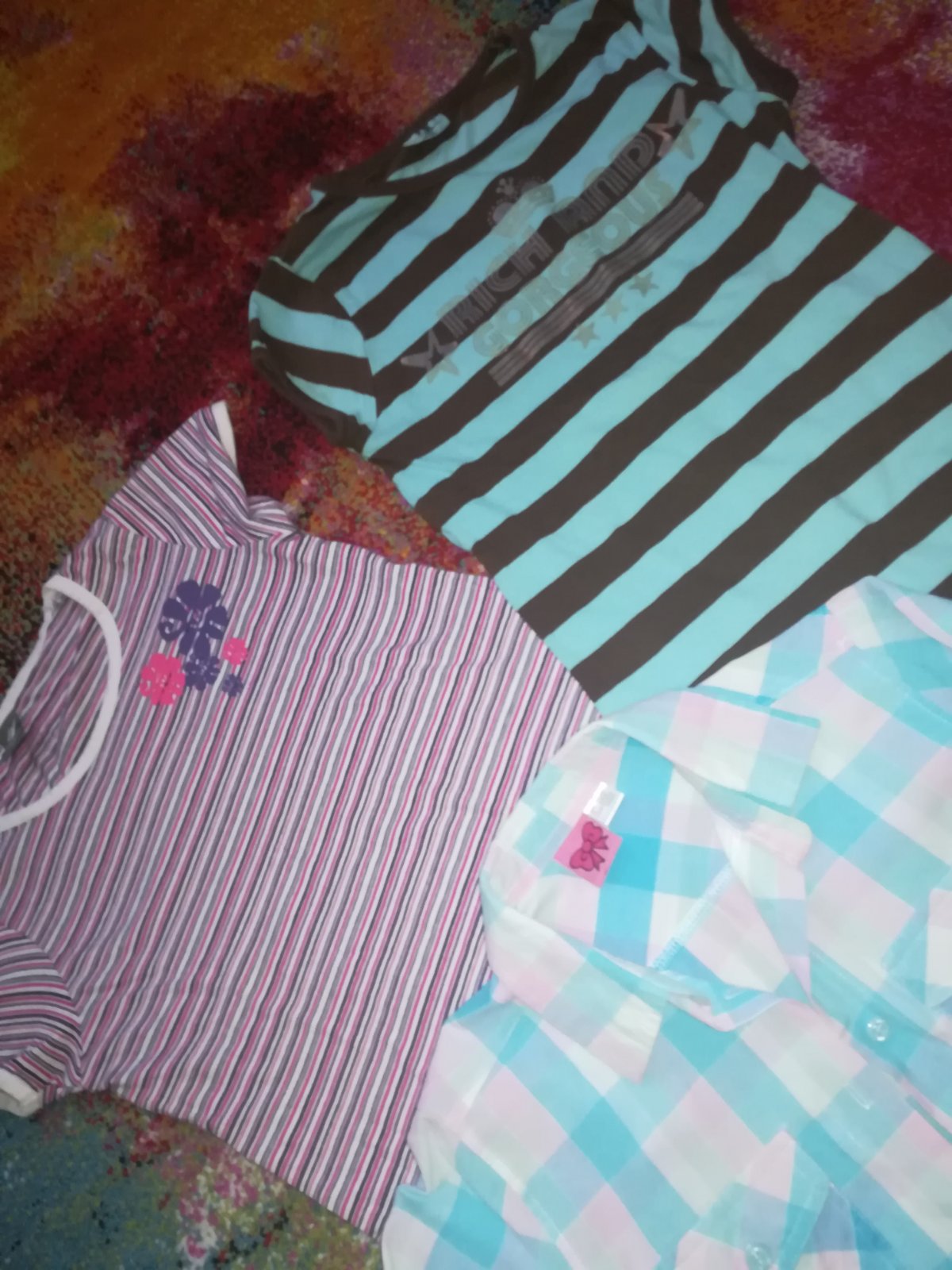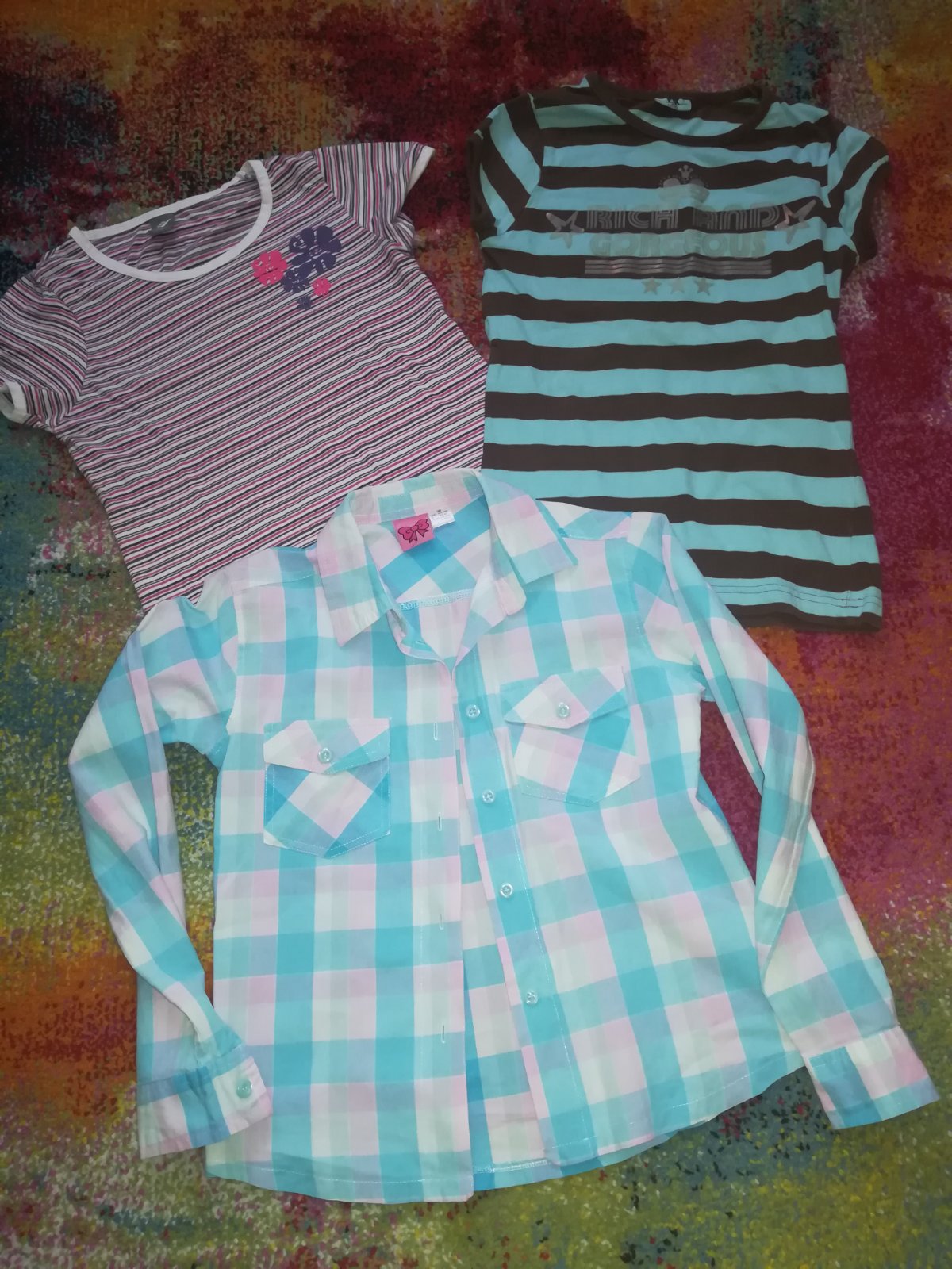 Pred balík oblečenia veľkosť 140, obsahuje 2xtricko s krátkym rukávom a košeľu s dlhým rukávom cena všetko spolu 3,50 eur
