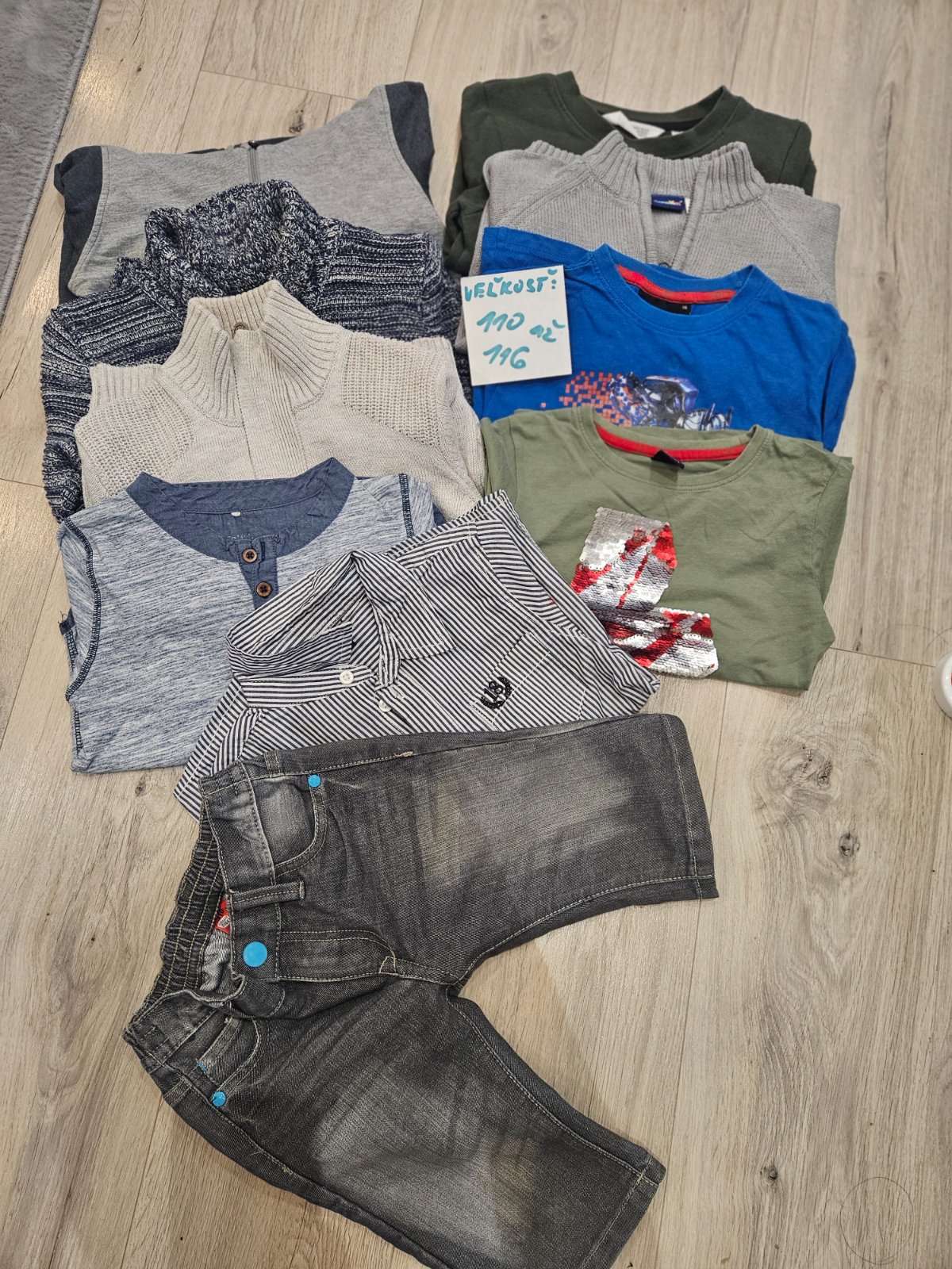Predávam twnto balík, ktorý zahrňuje pekné pulovre , tričká dlhý rukáv, aj košeľa plus rifové kraťase...veľkosť 110 až 116...spolu ako balík