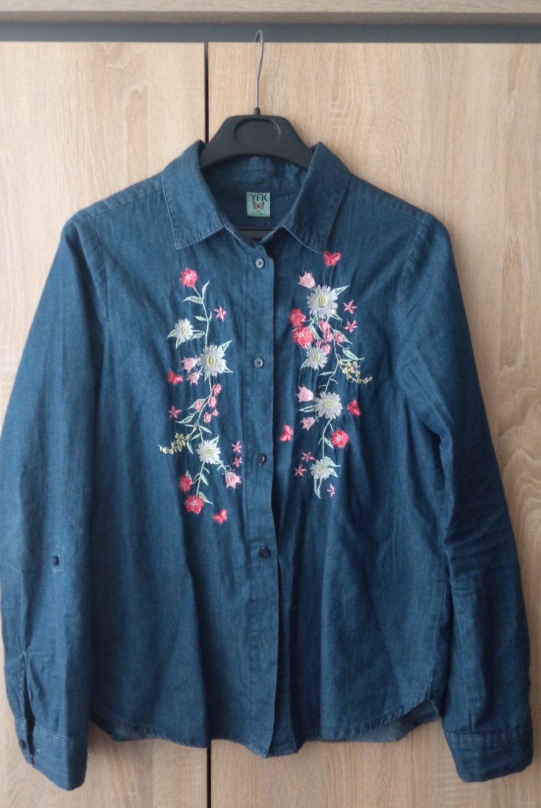 -Tmavomodrá košeľa s kvietočkami s gombíkom na možnosť skrátenia rukáva veľkosť 158