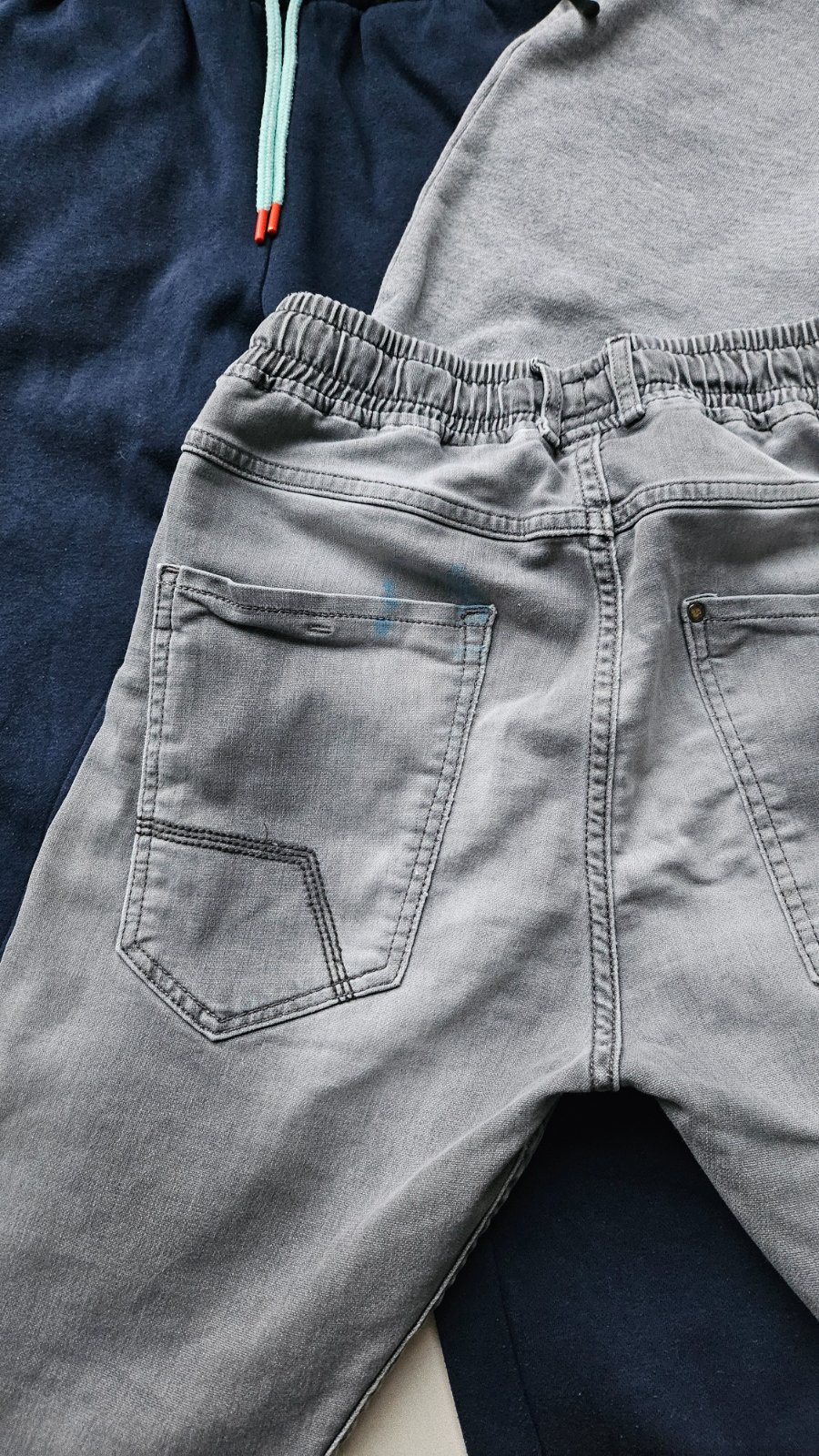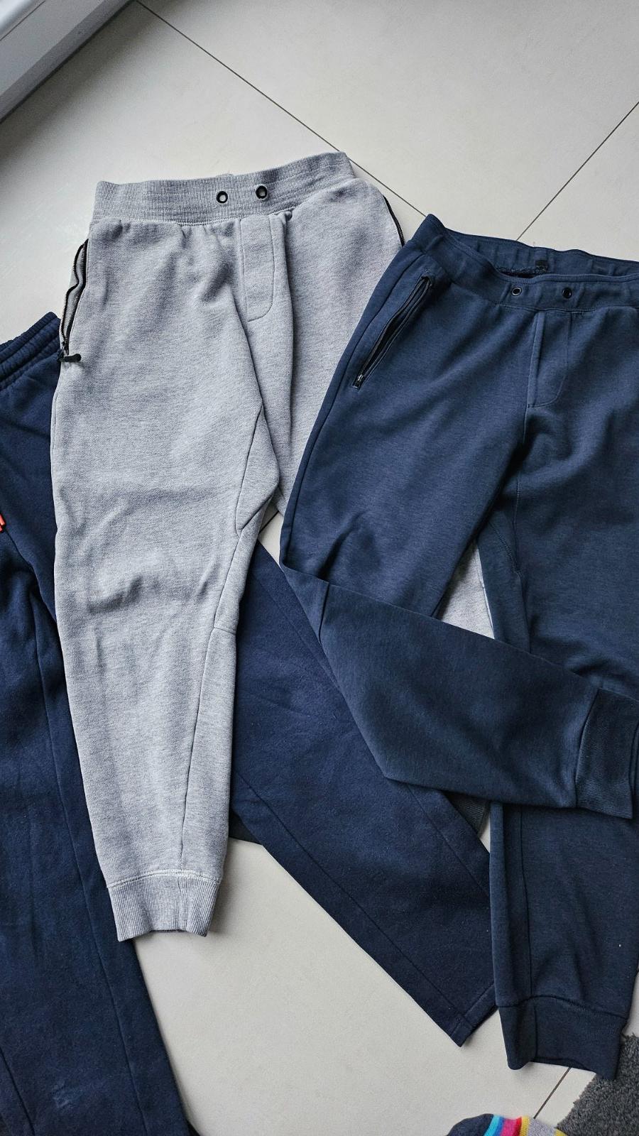 Vsetko velkost 158 a aj tak sedi. 4x teplaky pekny noseny stav. Zlava troje hrubsie a vpravo modre tensie. Dvoje vpravo davam do balika zdarma!. 3x nohavice pekny stav iba tie sive maju z vytvarnej modry flak na zadnom vrecku. Neslo oprat. Inak vsetko ok. Predam iba spolu.