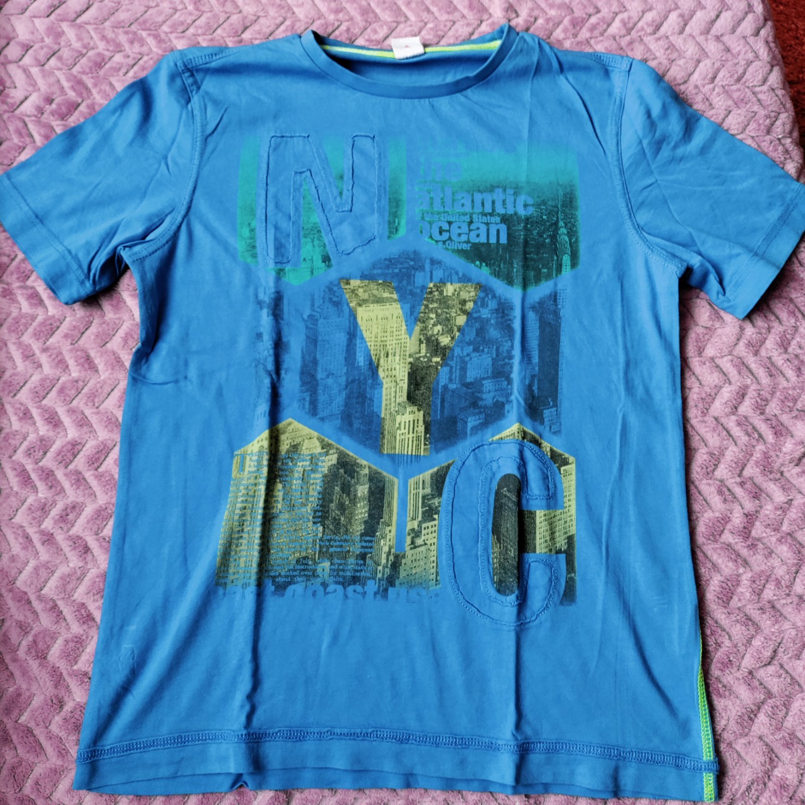 Tričká vel152/158 ,modré s botaskami Italia,druhé s budovami s.Oliver,dl62-63cm, s45cm,bez poškodenie,tricka svetle Bonprix vel152/158 dl60cm,s44-45cm, bez poškodenia cena spolu 8€ plus poštovné