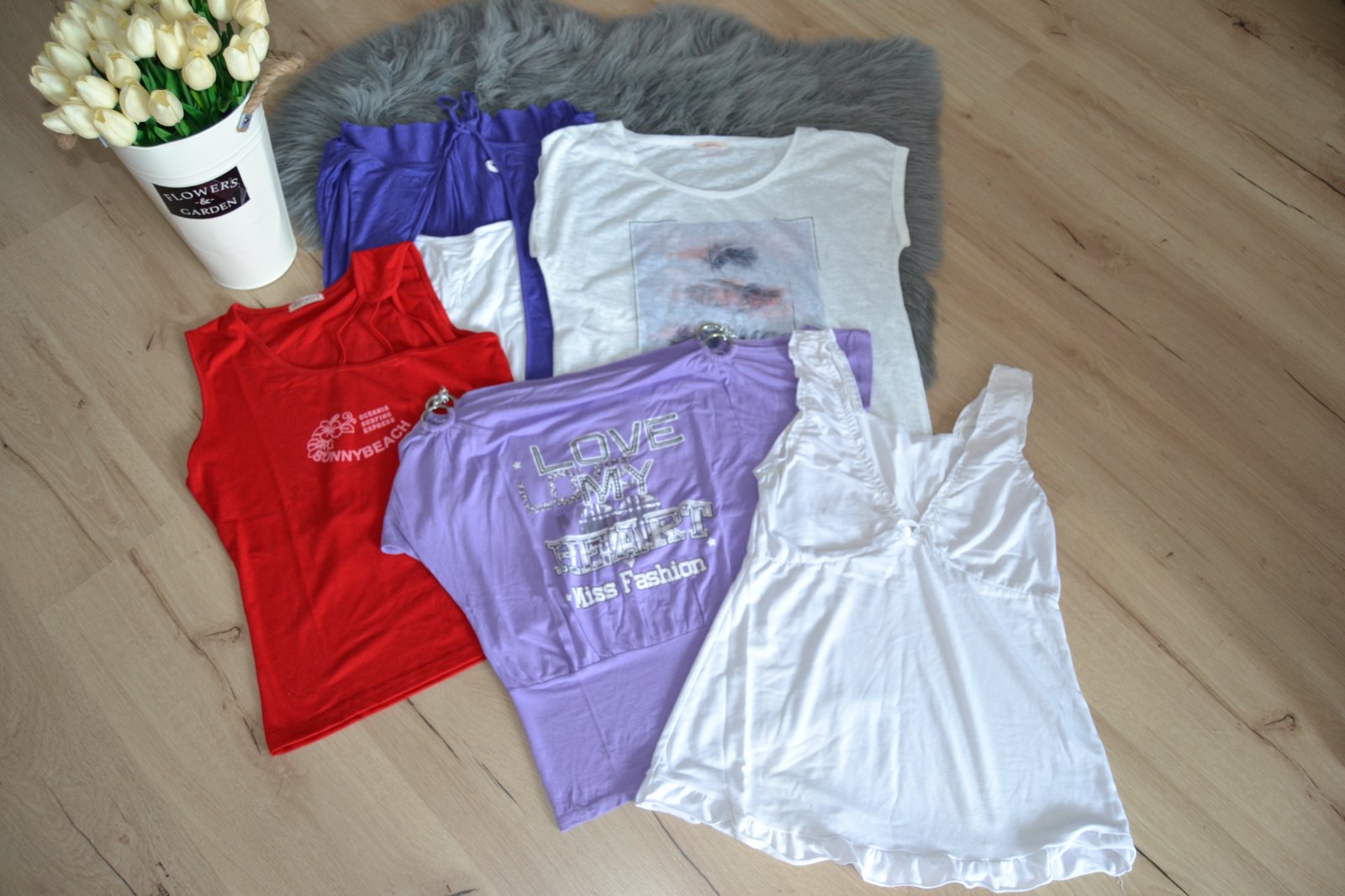Balík dámskych tričiek 5 ks/9e, veľkosť M, farby biela, fialová a červená. Málo nosené v top stave.