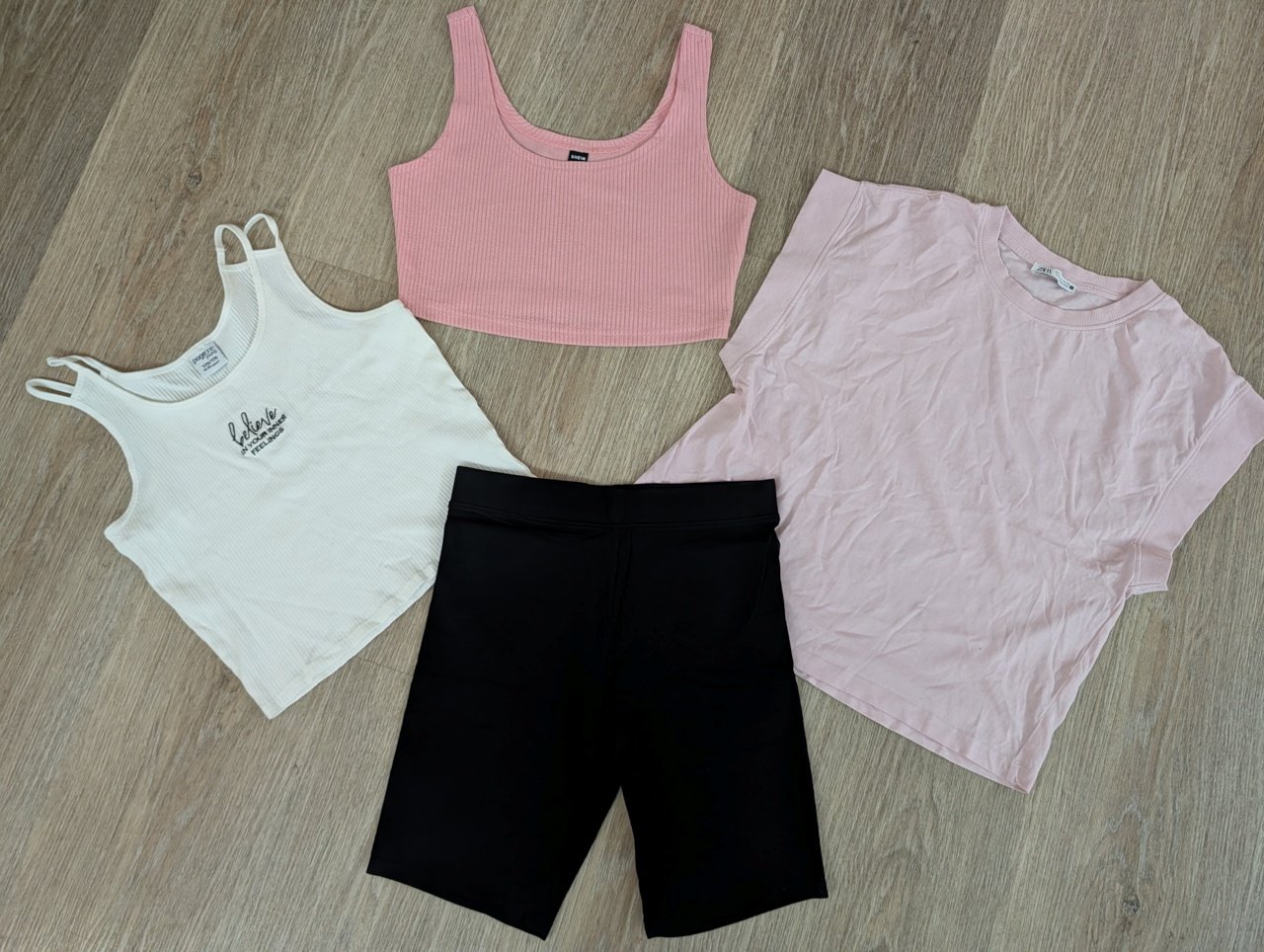 Predám letný balík, veľ. S-M, balík obsahuje 1x krátke legíny, 2x crop top a 1x tričko s krátkym rukávom. Veci nie sú poškodené, neboli často nosené. Cena je za celý balík, bez poštovného.