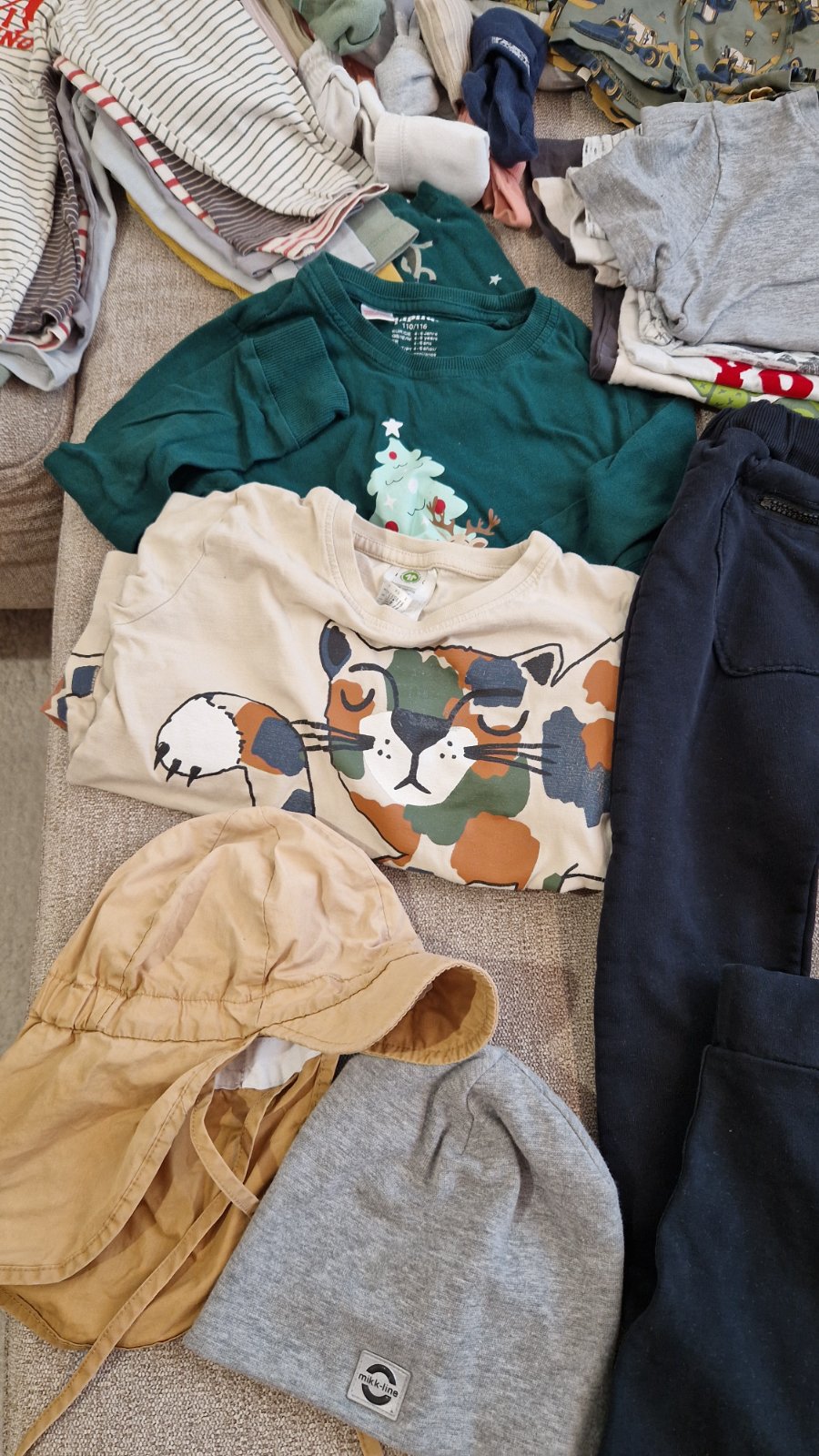 Veľký balík oblečenia pre chlapca, veľkosť väčšinou 104, niektoré 110 ale veľkosťne sú rovnaké resp veľmi podobné, nosili sme naraz, značky sú tam Lindex, Zara, H&M, Lupilu, Next, čiapka a UV klobúk Mikk-line, tepláky Rebel aj Sergent Major..