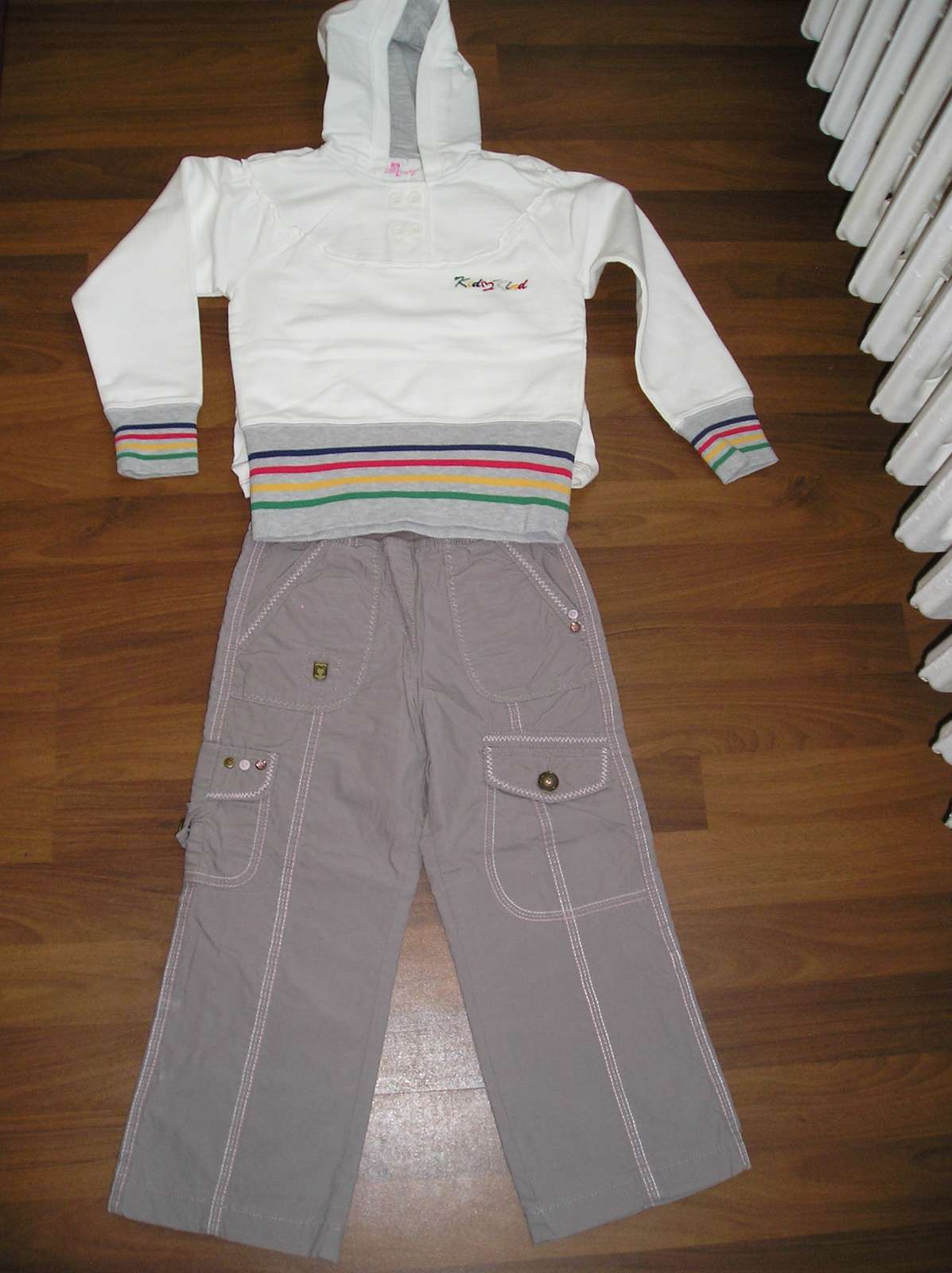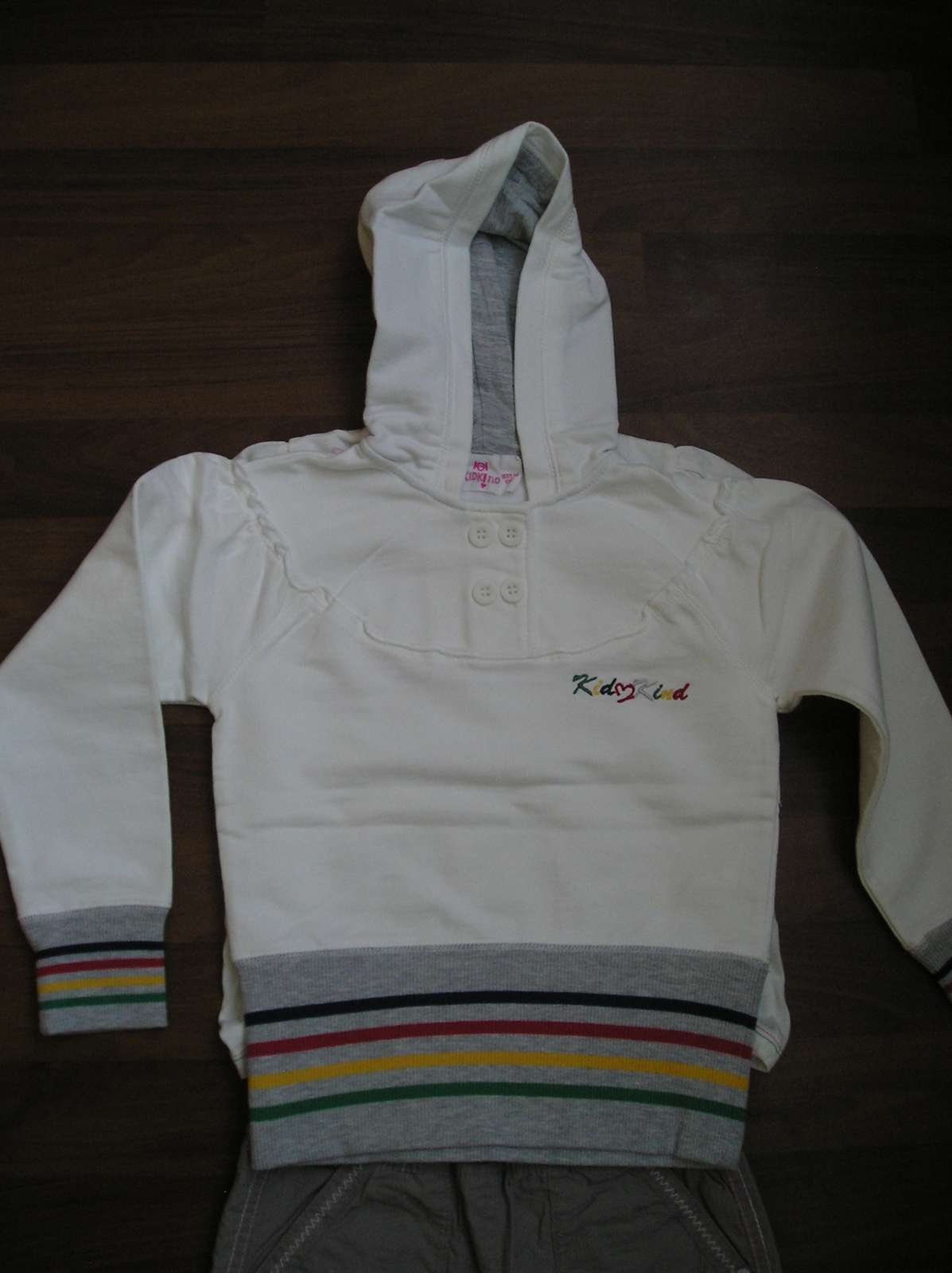 Biela mikina s kapucňou a šedým úpletom na rukávoch a dole na mikine. Zn. Kidkind. Veľk. 107/113cm. Dĺžka 41 cm, šírka pod pazuchami 34 cm, dĺžka rukávu od krku 48 cm. Perfektný stav.