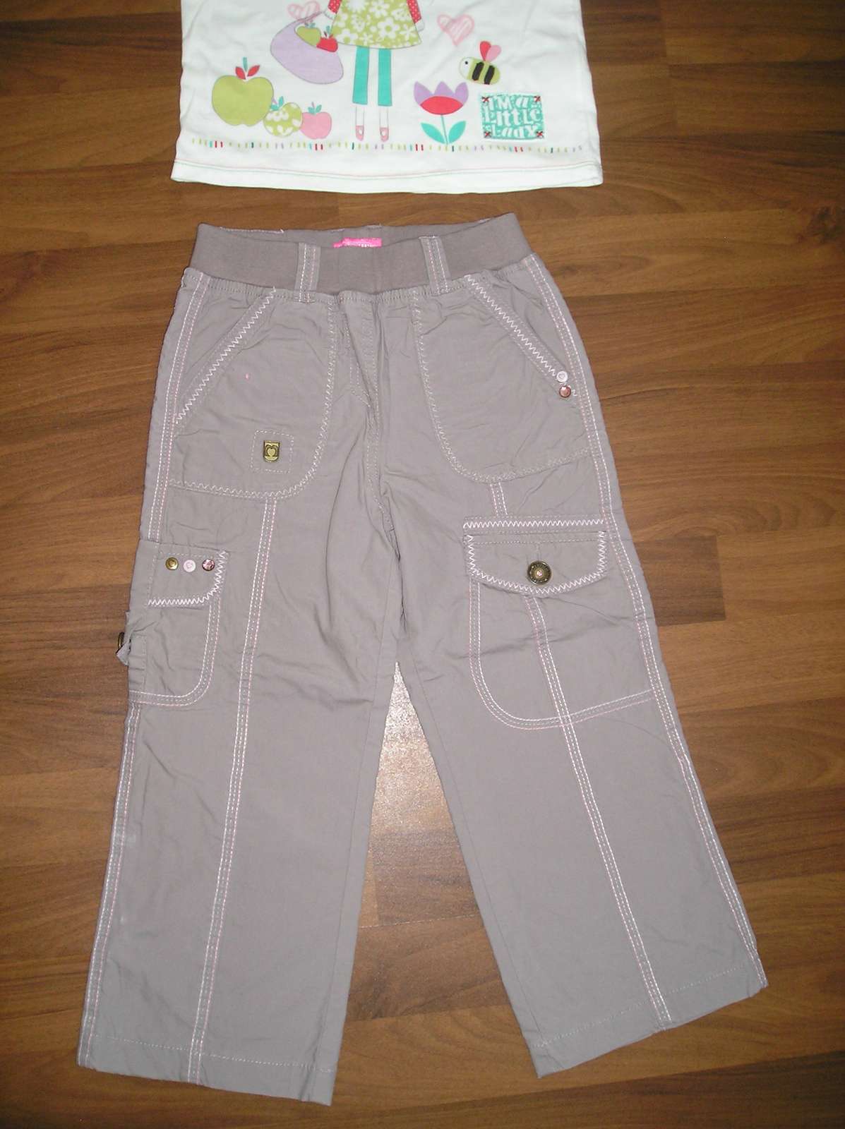 Šedo-hnedé nohavice s bielym a ružovým štepovaním, zn. Sweet Millie, dĺžka 60 cm, v páse je guma, v kľudnom stave meria 22,5 cm, 100 % stav.