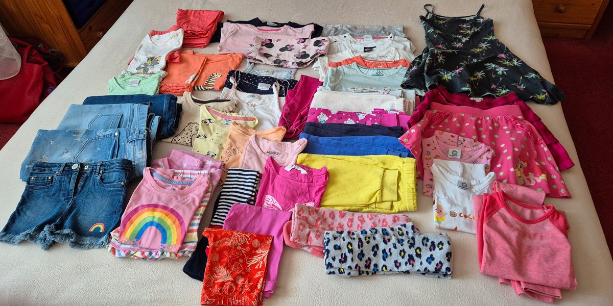 Posuniem balík dievčenských vecí 98/104. Balík obsahuje tielka, tričká, pyžamká, pančuchy, tepláky, legíny, rifle, šaty, sukne, atď.