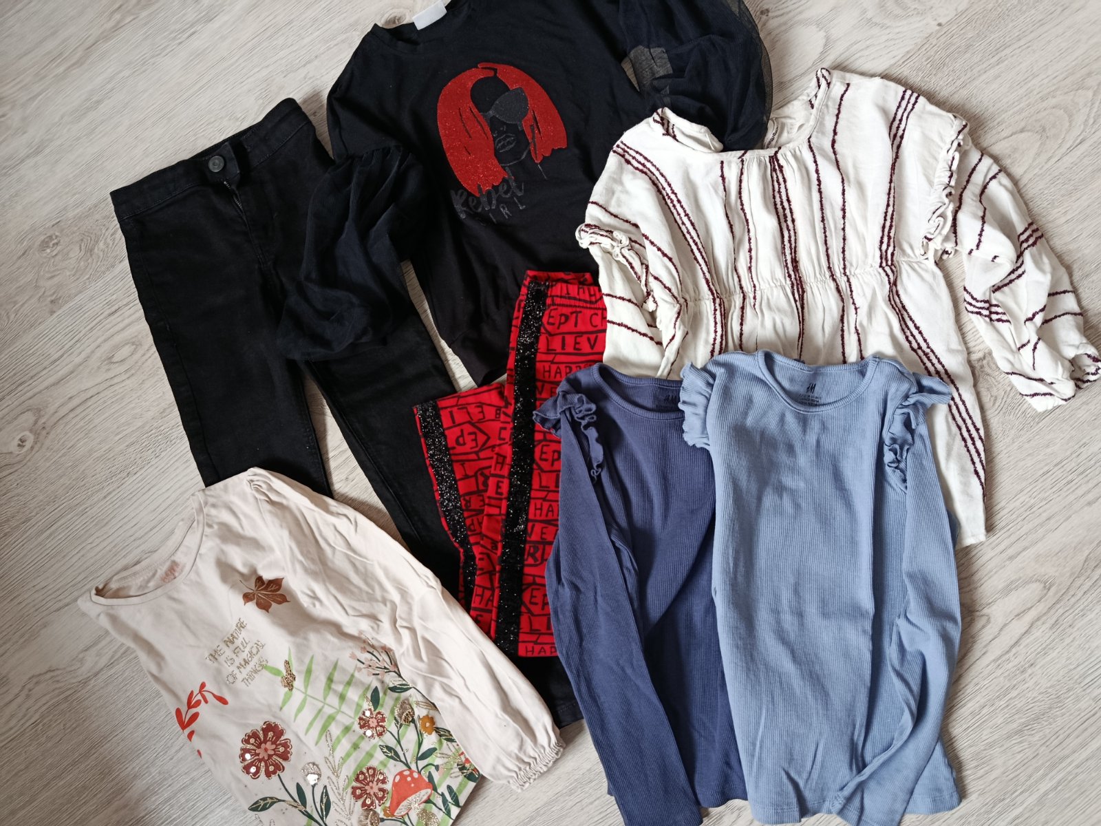 Dve tricka H&M bez poskodenia ,cierle leginove rifle,leginy plus mikina ,bluzka zara ,krasna len velkostne mensia ako je udavane,tricko- bodka na rukave