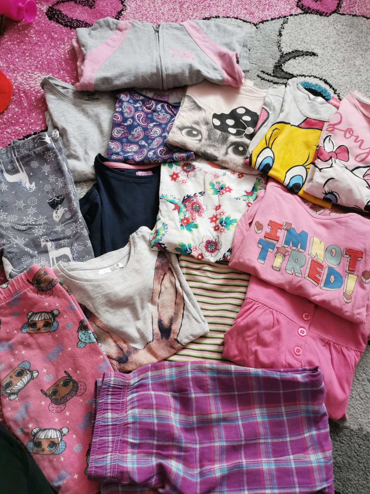Balík oblečenia obsahuje tričká krátky aj dlhý rukáv veľkosť 4-5rokov, mikinu, 2x legíny a pyžamové nohavice. Niektoré majú známky nosenia,niektoré málo nosené. Cena spolu za 15ks.V