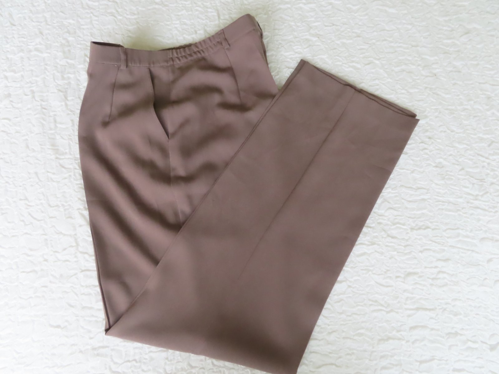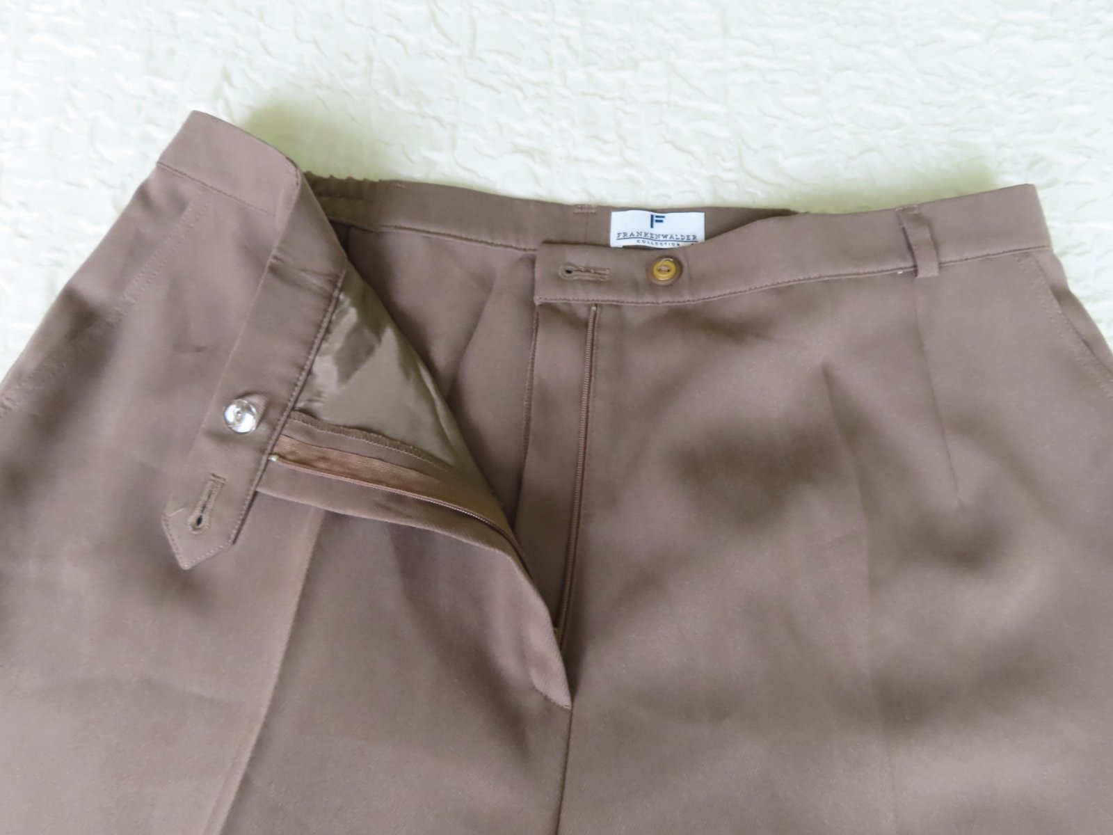 2/ Elegantné nohavice Frankenwalder, veľ. 44/XL - rozmery: bočná dĺžka 111cm, od rozkroku 81cm, pás má 2x43-46cm - po bokoch sú gumičky, pekne stoja na postave. Farba hnedá až karamelová.