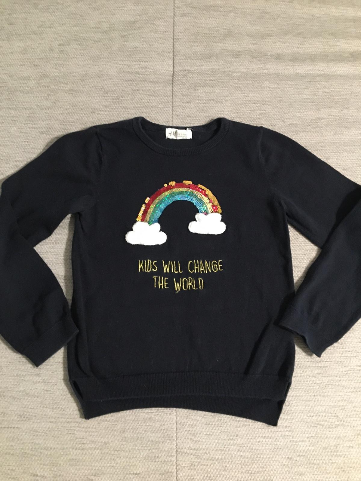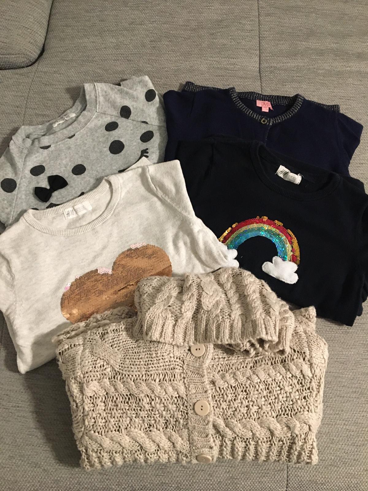 Vo velmi dobrom stave. Pulovriky zn. H&M - velkost 122-128, tmavomodry svetrik zn. OVS velkost 128, bezovy svetrik zn. Mayoral velkost 122.