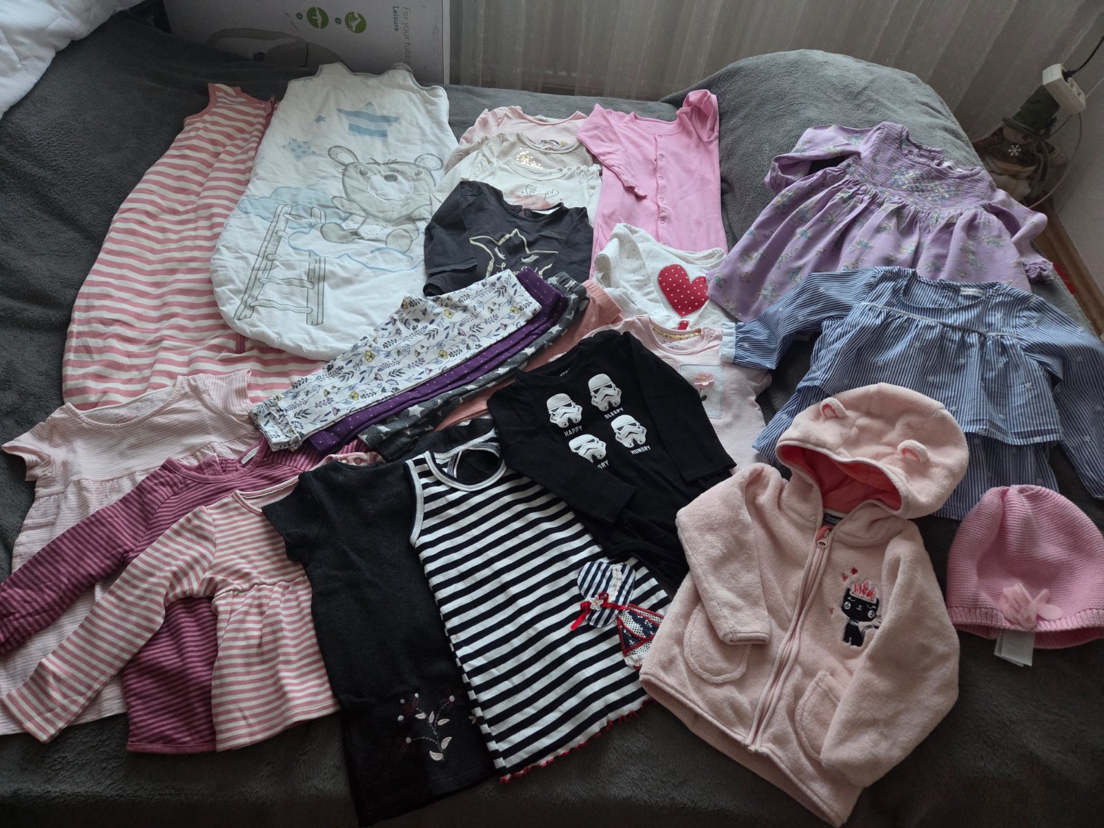 onúkam balík oblečenia pre dievčatko 86. Spacie vaky 2 ks, mikina na zips s uškami, 4 ks tričko dlhý rukáv, 1 js krátky rukáv, 5 ks šaty, pyžamko, 2 ks kegíny, 3 ks tepláky, 2 ks šaty, čiapka, body. Cena spolu 10,00€ + pošta