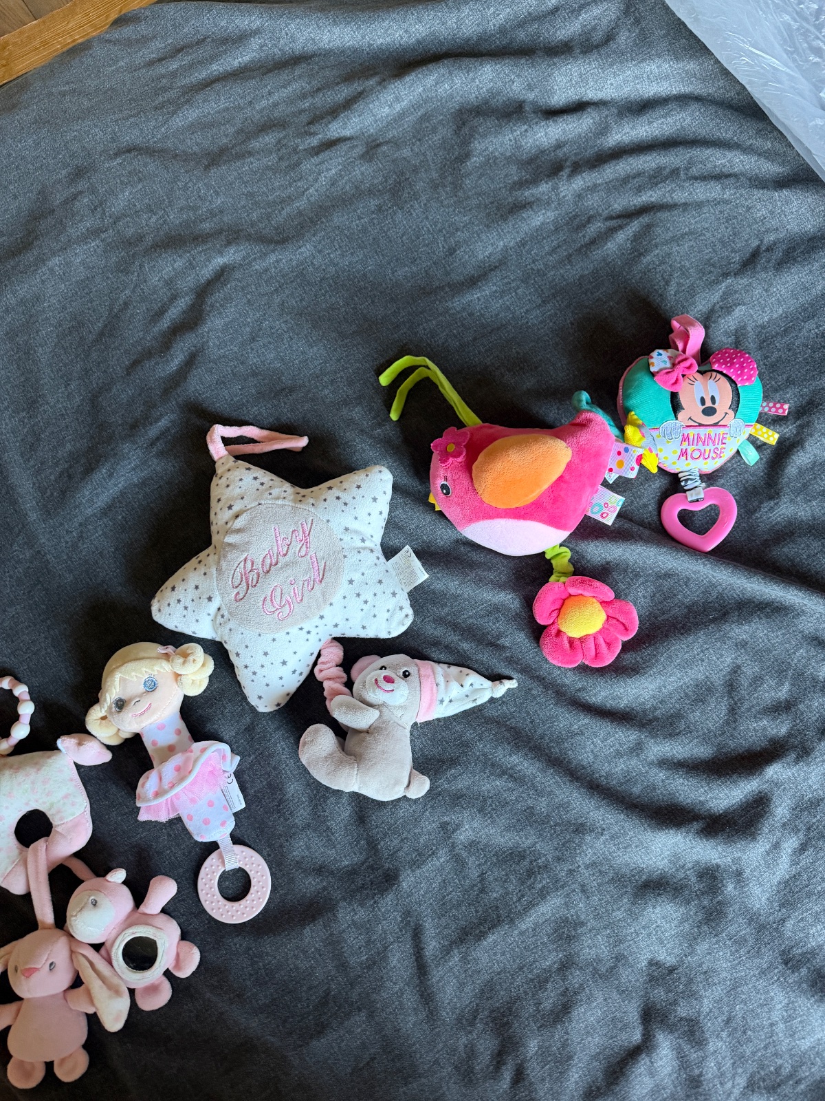 Sada farebných plyšových hračiek, ktoré vydávajú zvuky (hrkálky, šuštiace prvky). Minnie Mouse, vtáčik, hviezdička "Baby Girl", koala, motýľ…