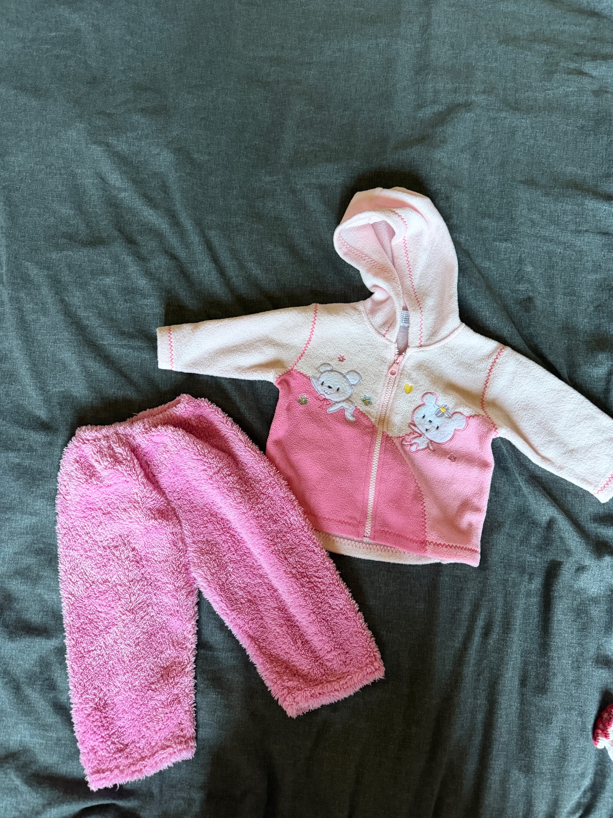 Súpravy a komplety: Ružová flísová súprava (mikina s kapucňou + mäkučké nohavice), kvetované šaty.