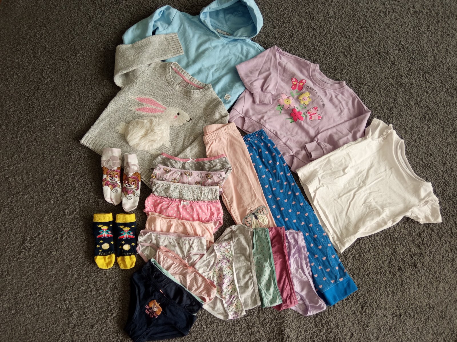 Modrá mikina je veľkosť 110, fialová 104, obidve sú kratšieho strihu. Pulovrik so zajkom je 116,'ale v pohode aj 110 podľa mňa. Tričko je tuším 104, aj legíny a pyžamové nohavice tiež. Spodné prádlo je od veľkosti 98-104..možno aj 110.