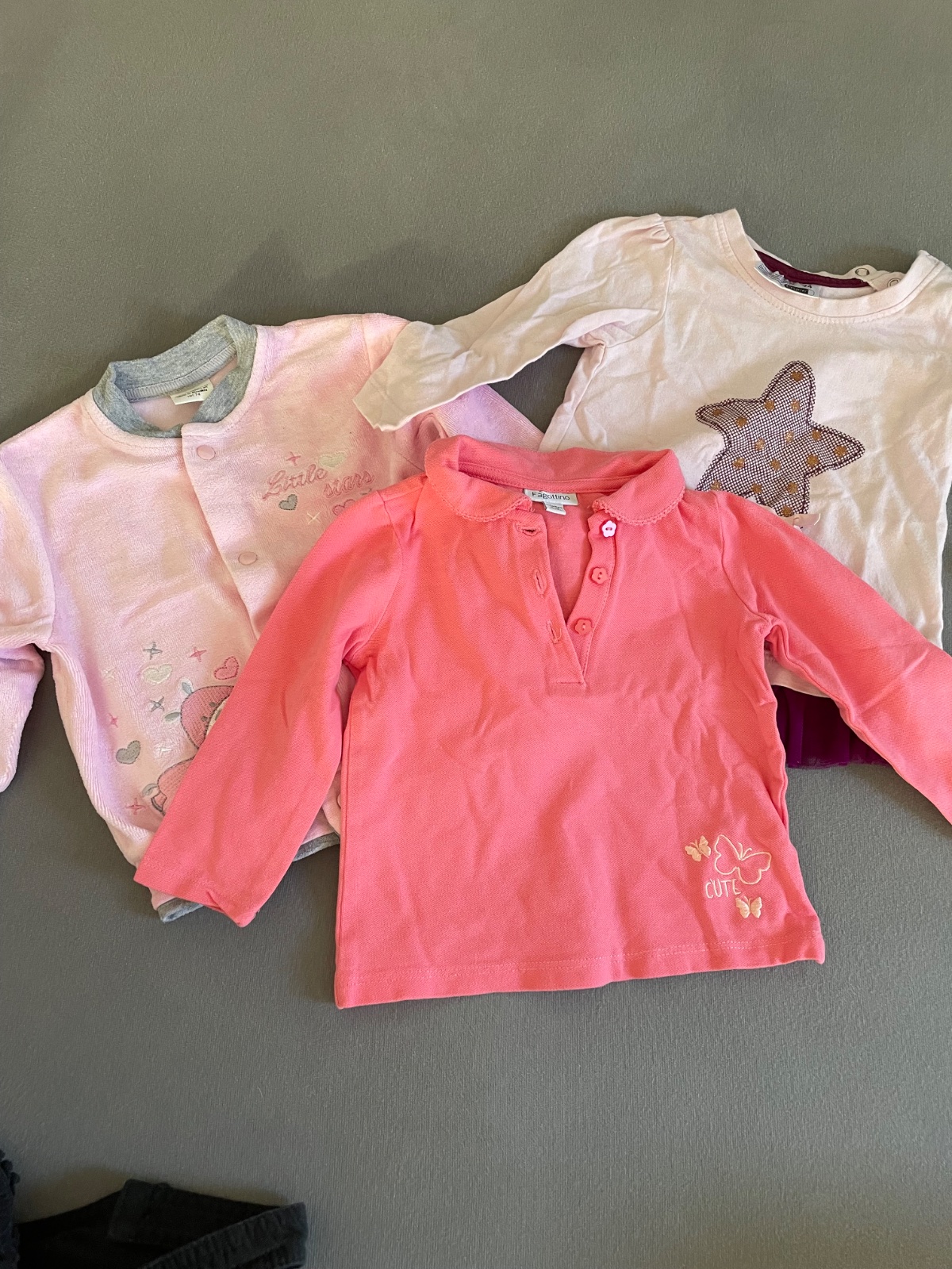 Predám väčší balíček oblečenia v. 74 - 6-9 mesiacov. Vecičky sú nosené, po 2 deťoch. Známky nosenia sú: vyblednuté farby z prania, popraskaná potlač a mini žmolky. Žiadna z vecí nemá ani fľaky, ani...