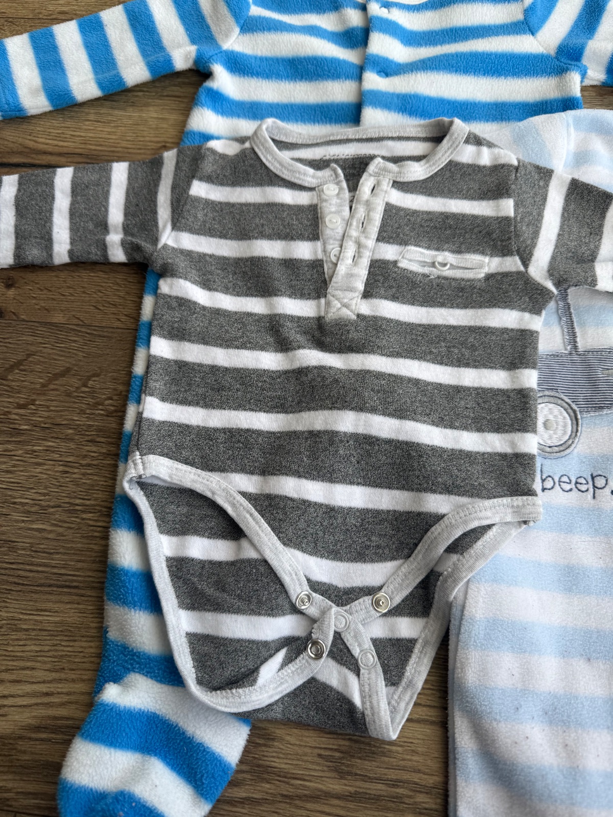 Body s krátkym rukávom 3x TESCO psíci, pásikové, modré. Veľkosť 56. Cena za jedny 1 €.