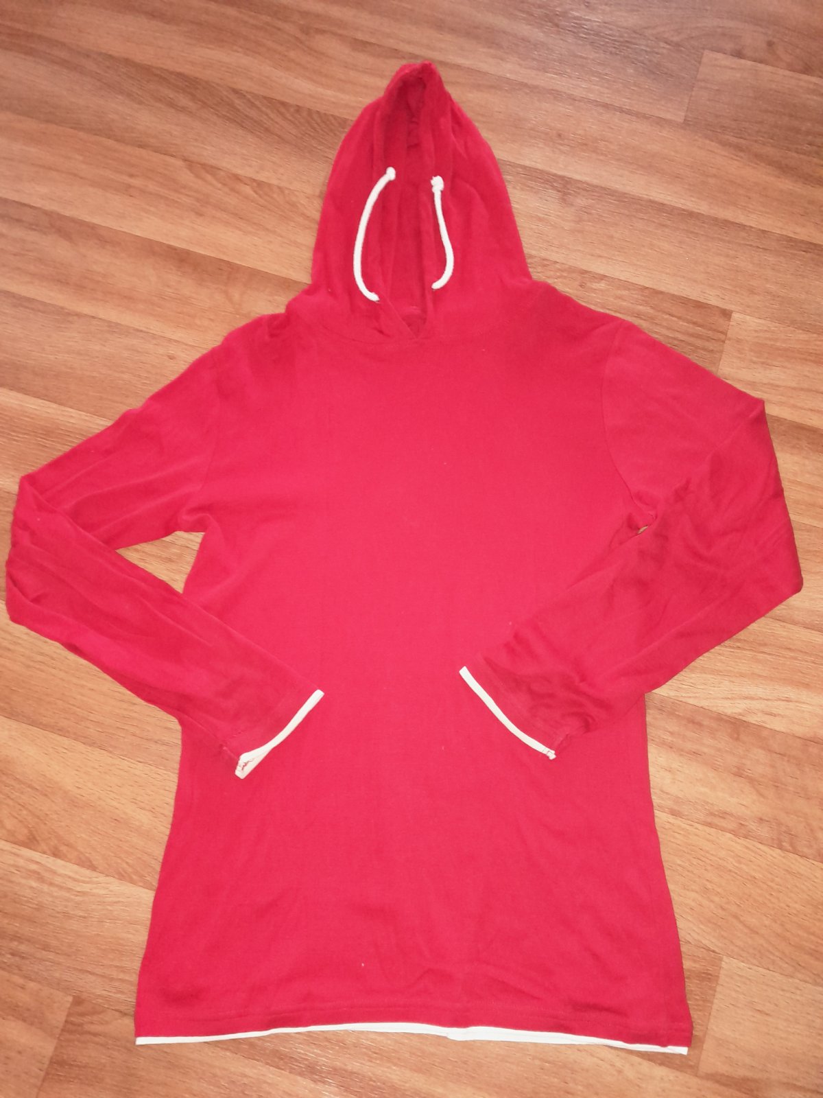Červená je tenká-je to akoby tričko s dlhým rukávom a kapucňou.