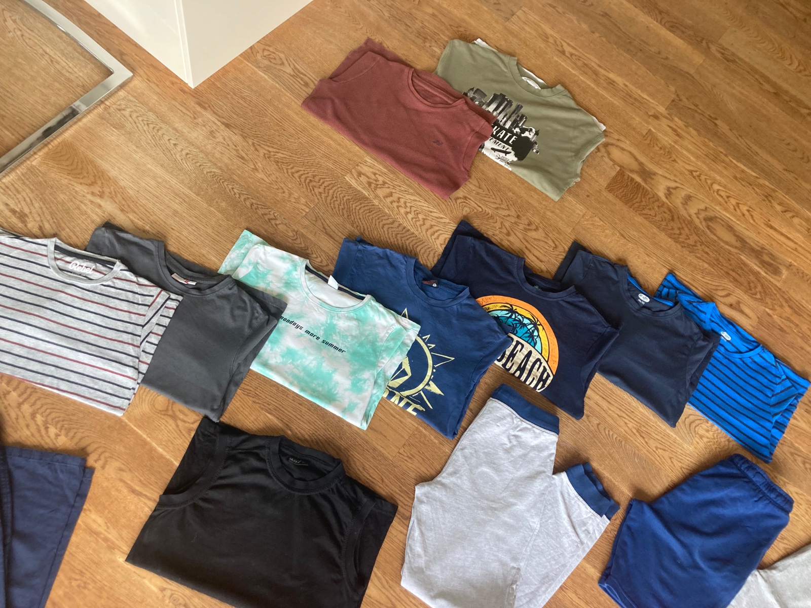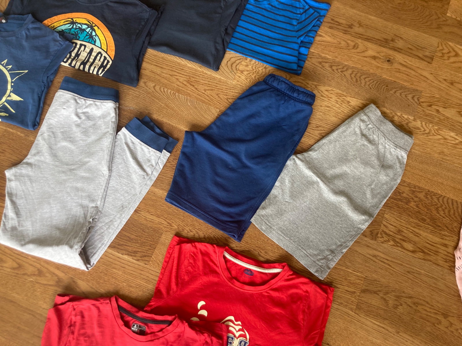 Balík veci po synčekovi v peknom nosenom stave. 6x tricko s krátkym rukavom /lindex bielozelene fliacik/, 5x tricko s dlhým rukavom /reserved aplikácie už nie sú až tak pekne/, 1x tenké nohavice s reguláciou v pase, 1x tielko, 1x tenké teplaky, 2x kraťasy a 2x mikiny vidieť pranie značky reserved, lindex, rebel, hip hoops, peppers a H&m