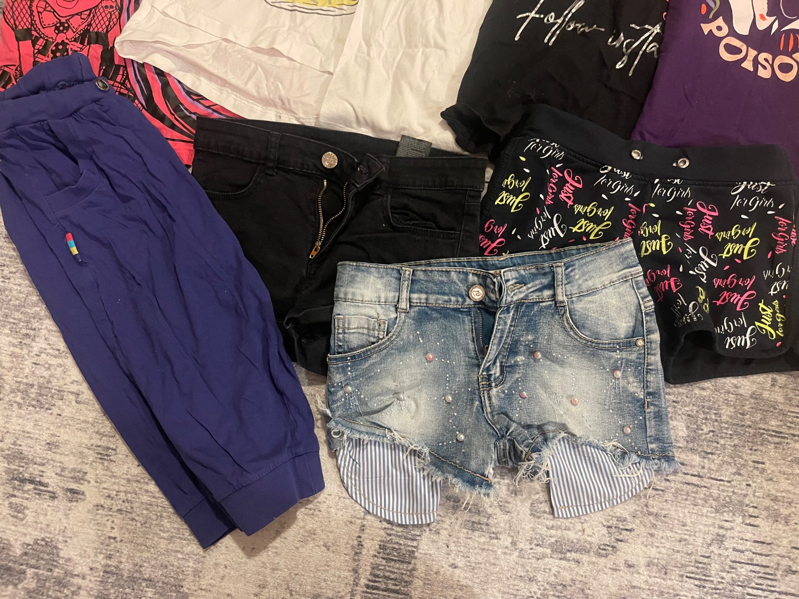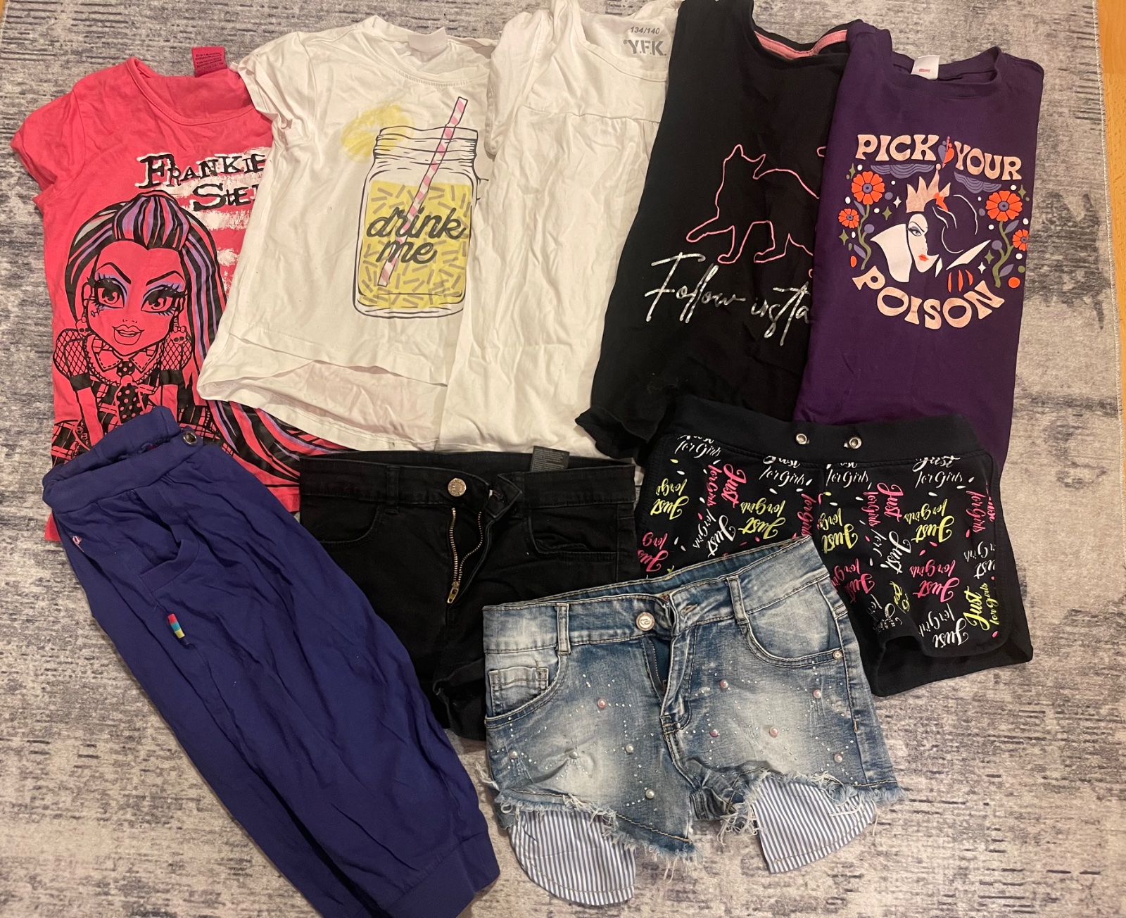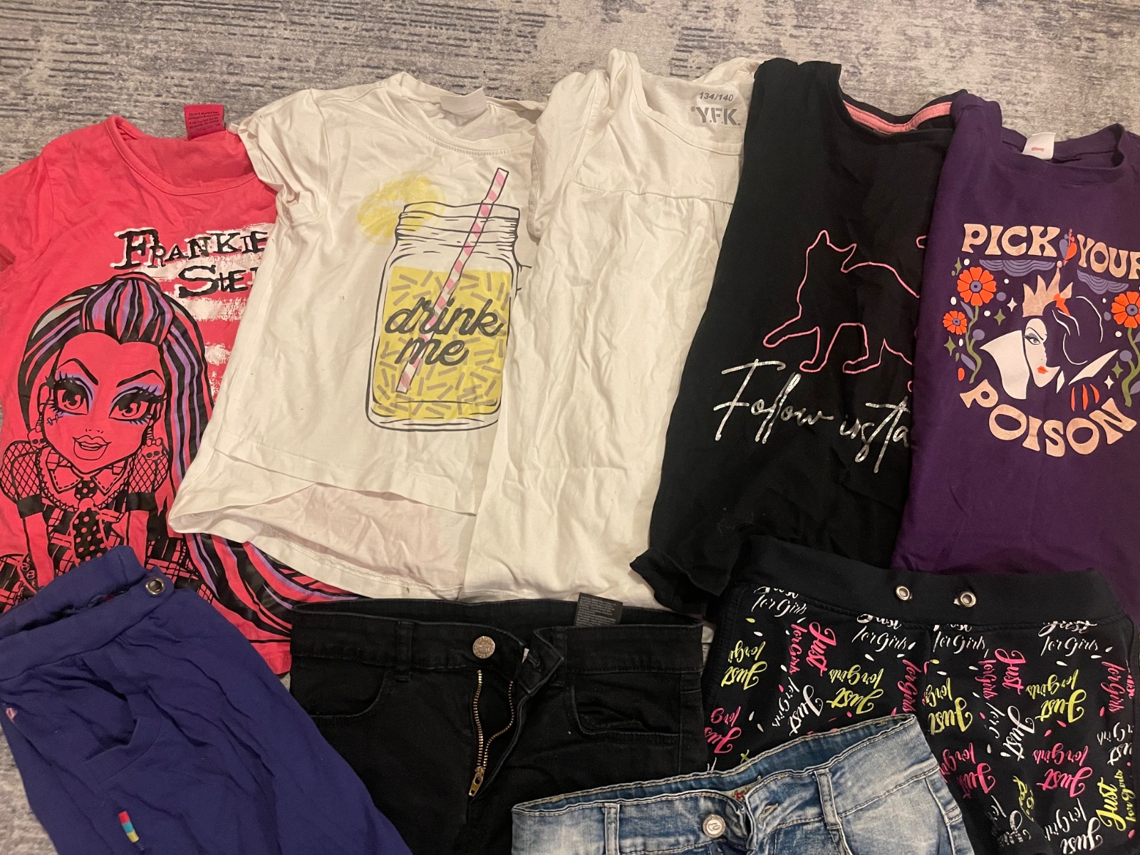 Veľkosť 128 - 140, kľudne premerám. Nájde sa malý fliačik, ale všetko ešte bez problémov do školy vhodné. 5 eur plus pošta skebo KE, PO a okolie