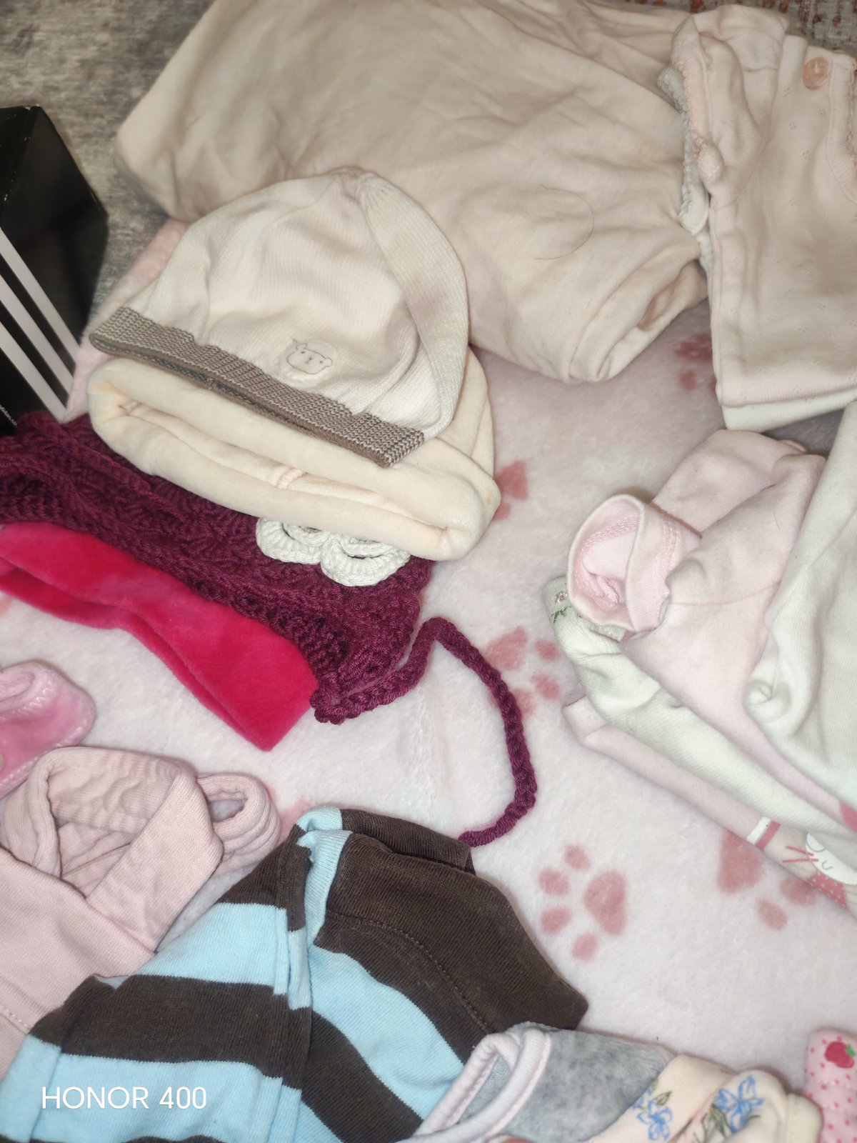 4x čiapočka, jedna háčkovaná. 1 šatka George 0-6m, 1 čelenka
