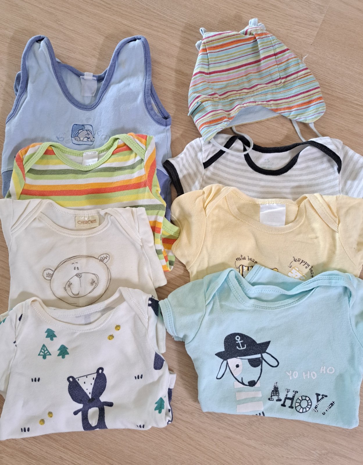 Zachovalé body s krátkym i dlhým rukávom pre bábo cca 0-6 mes. + 1 čiapočka
