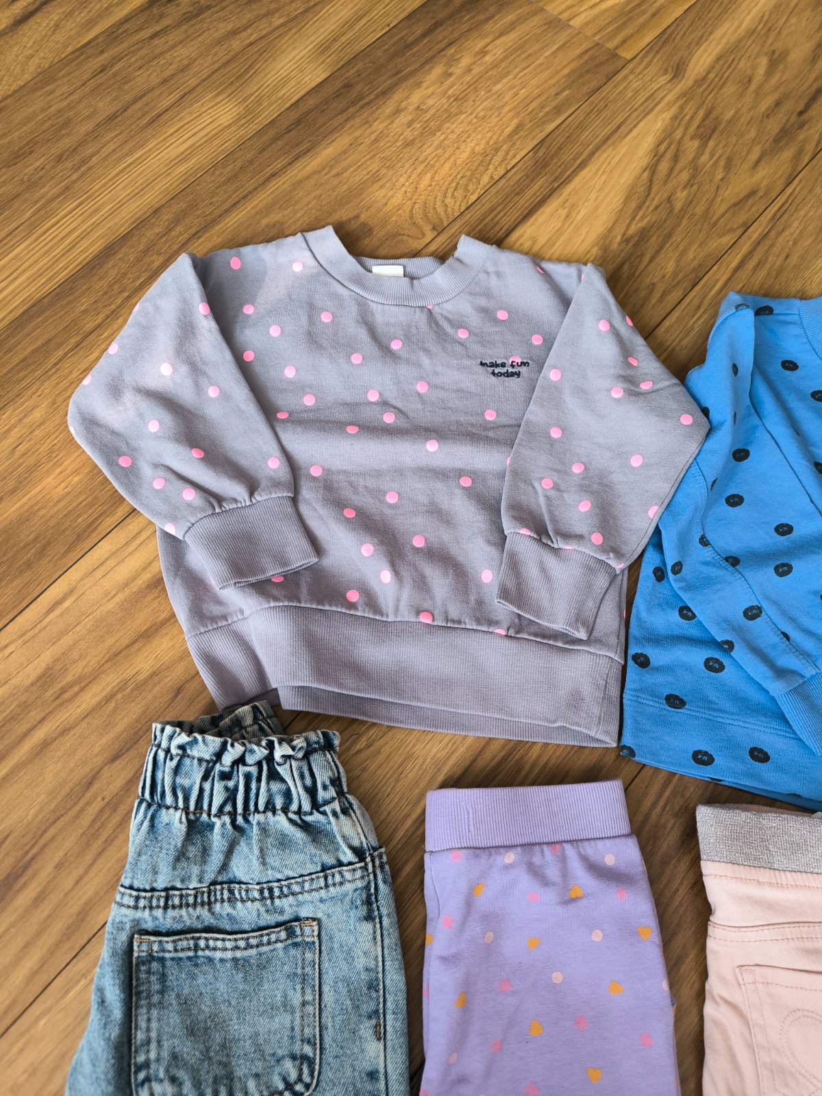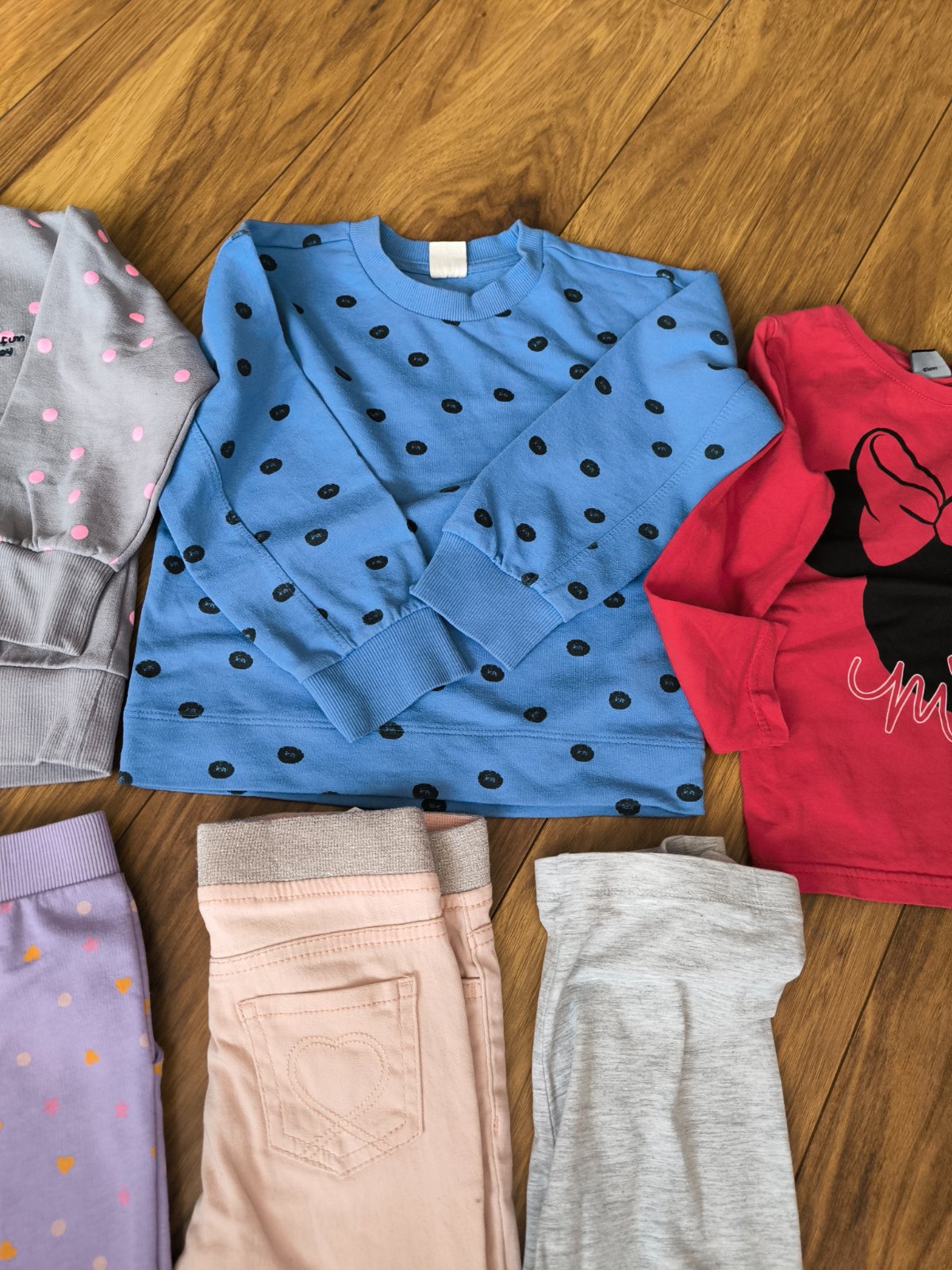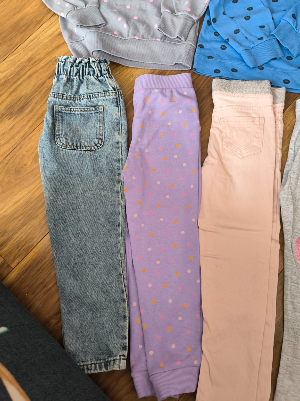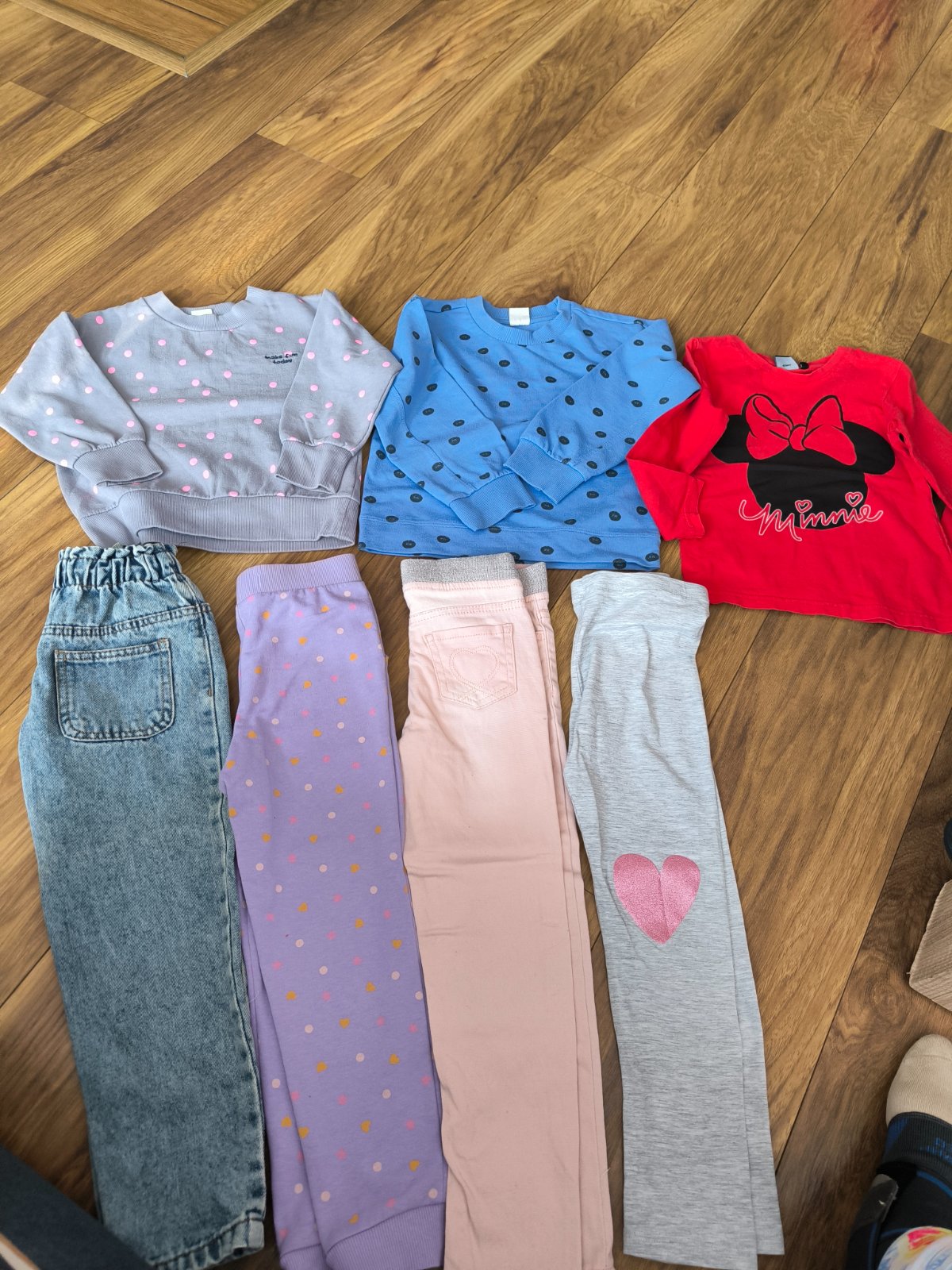 Veľmi pekný noseny stav ,Natelnik,mikiny zateplená aj nezateplena,rifle ,tepláky legíny dzeginy.Spodne diely ponosite dlhšieSede legíny so srdiečkom sú 116 .