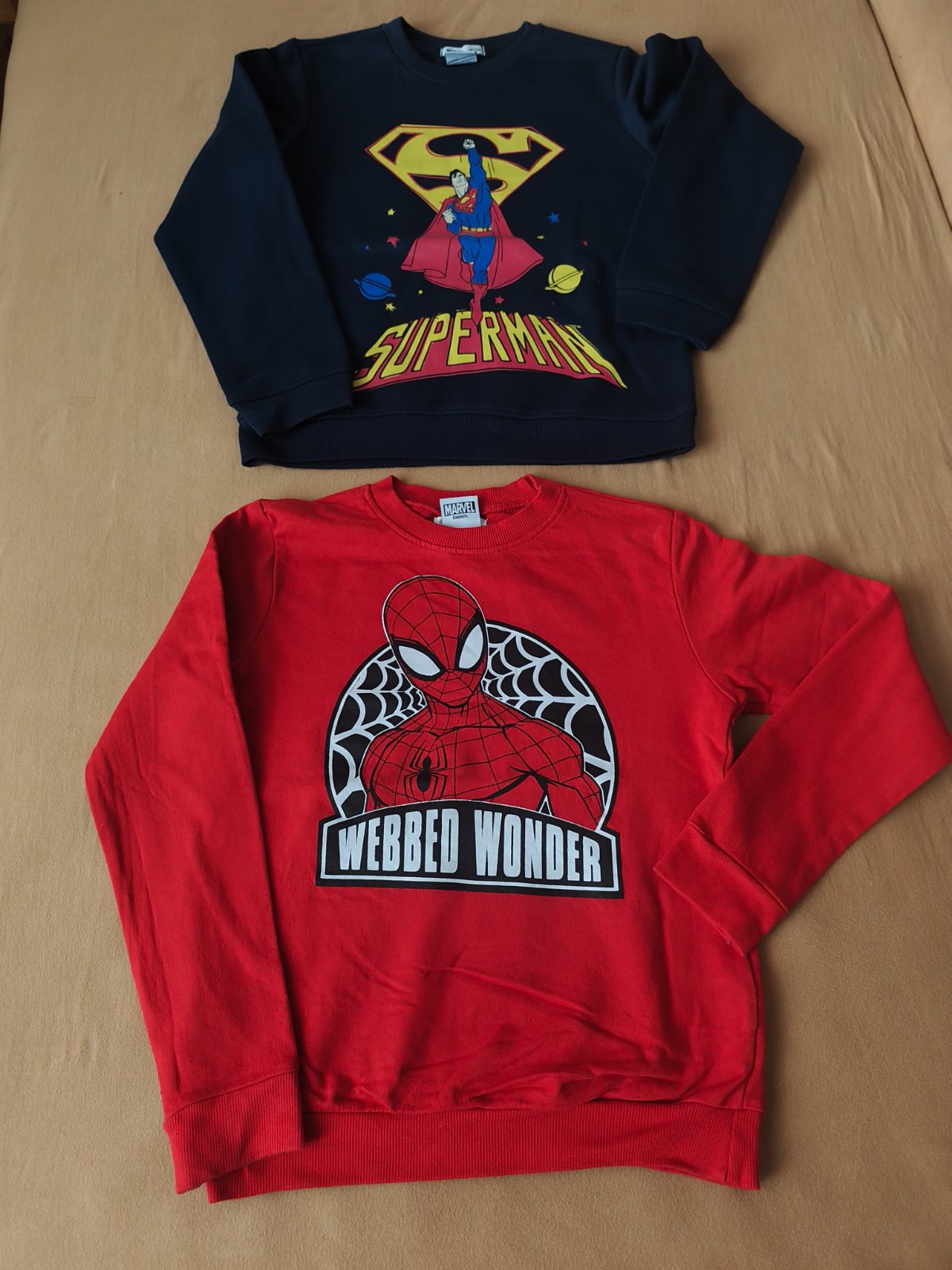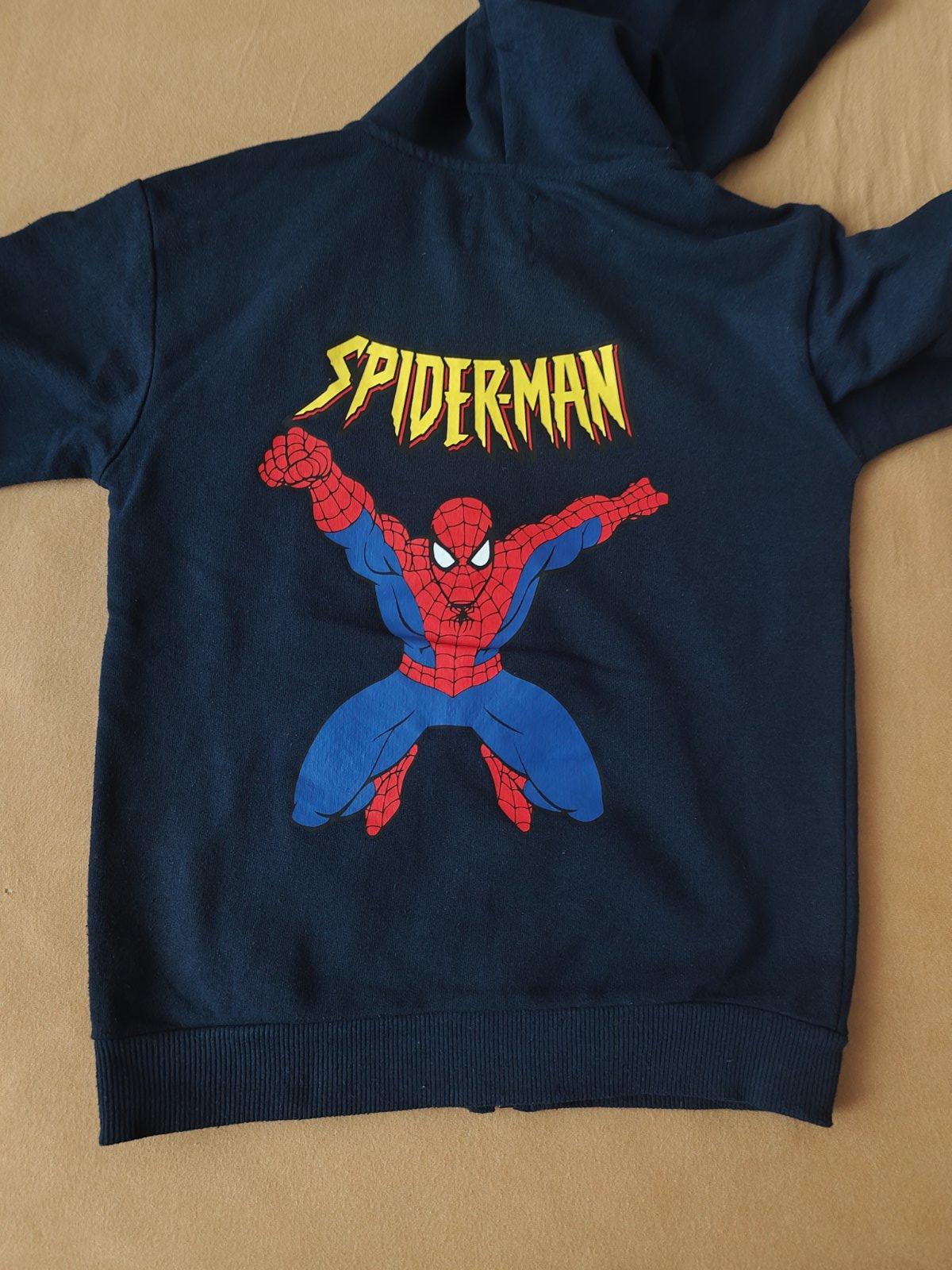 2x tenšia mikina červená Spiderman a tmavomodrá Superman, obe zn. Sinsay v. 140, obe nenosené, len oprané