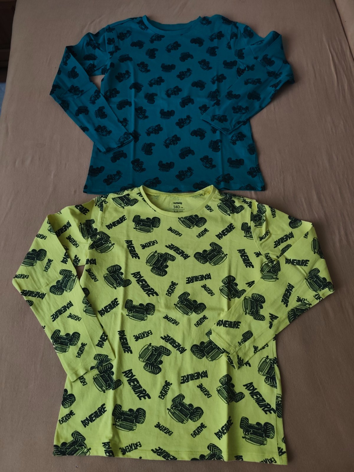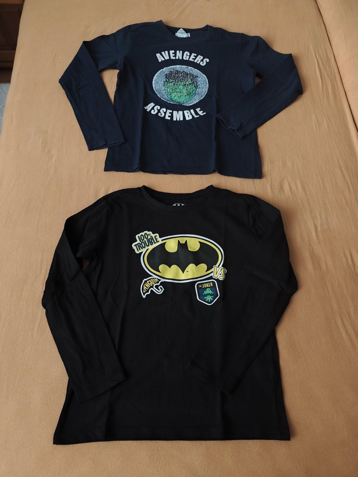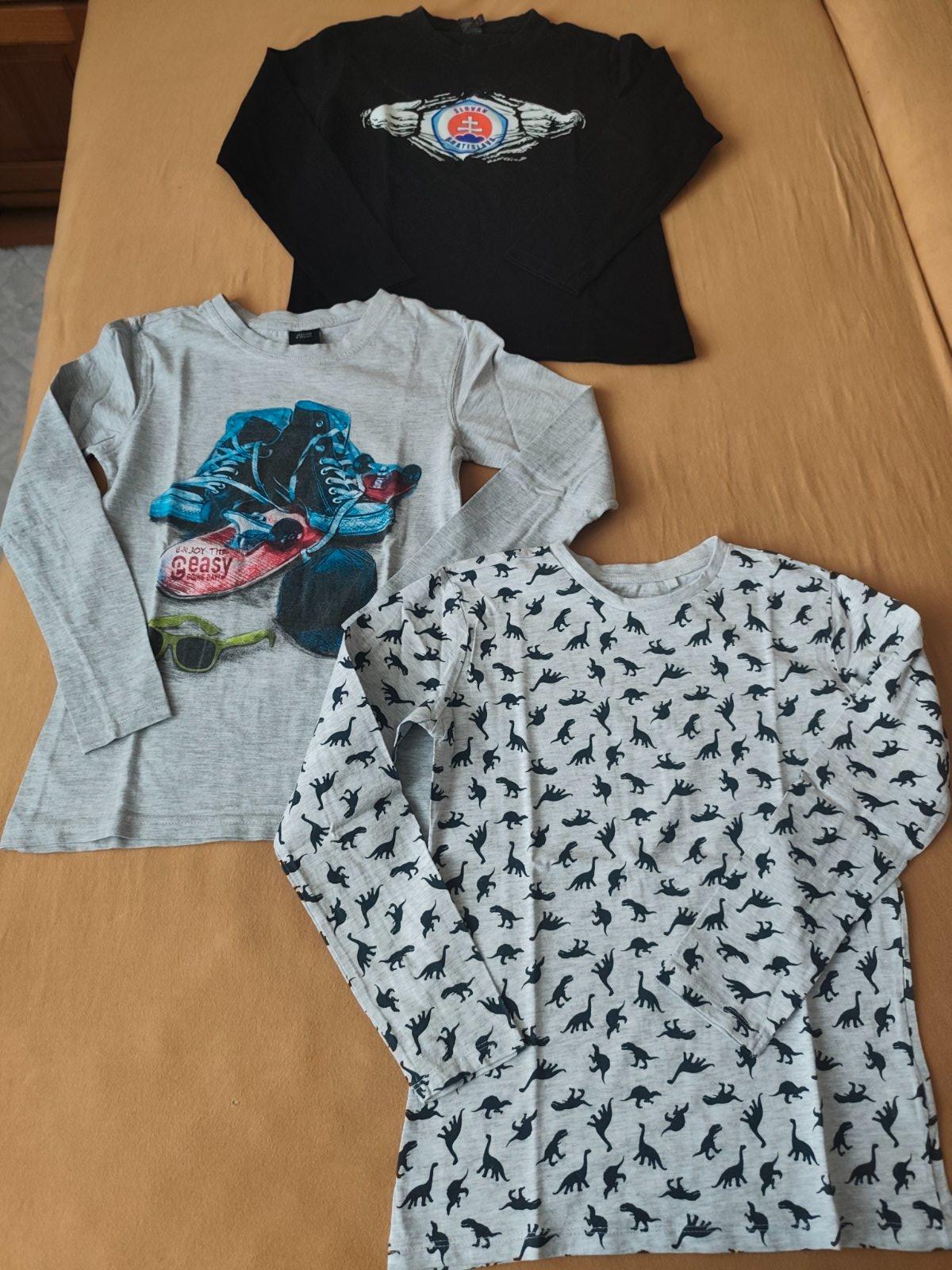19x tričko s dlhým rukávom - z toho 12x zn. Sinsay v. 140 (modré Superman, žlté s bágrom, čisto žlté, žlté s autami, šedé s dinosaurami neboli nosené, len oprané a biele so Spidermanom má na rukáve fľaky), 2x zn. H&M v. 134/140, 1x zn. Pepperts v. 134/140, 1x piazza Italia v. 9-10, 2x zn. Chapter young v. 133/140, 1x Slovan Bratislava v. 10 rokov