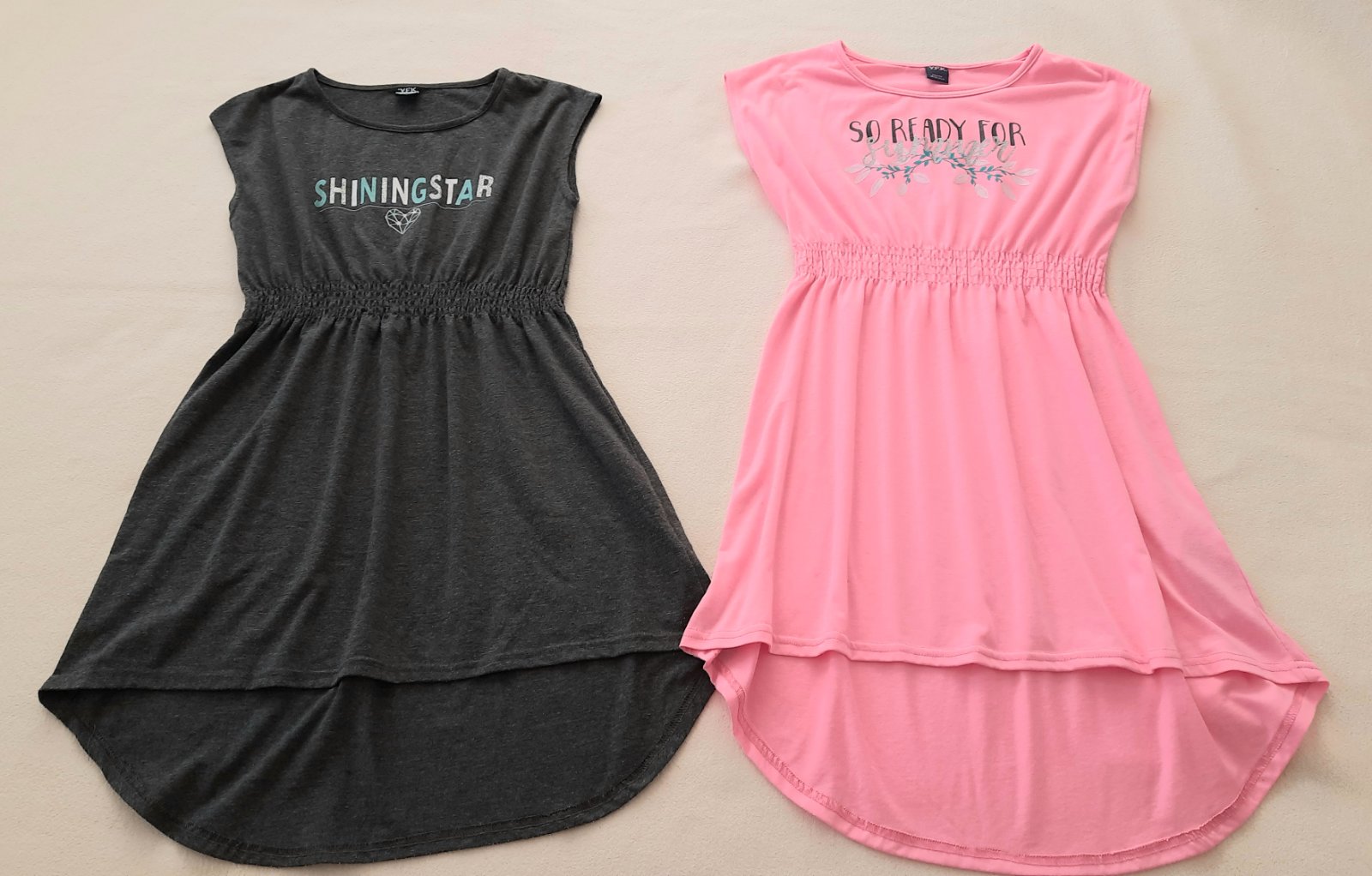 Predám dvoje nenosené šaty bledošedé 134-140 a neónové 146-152. Šedé sú v skutočnosti bledšie, krajšie ako na fotke.