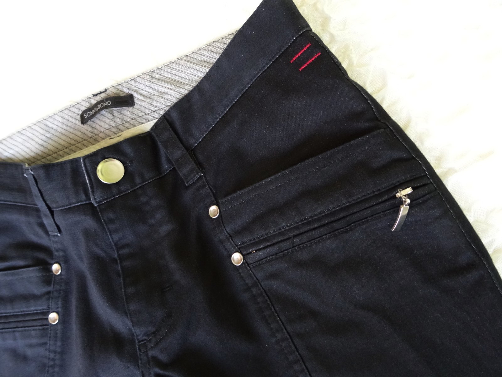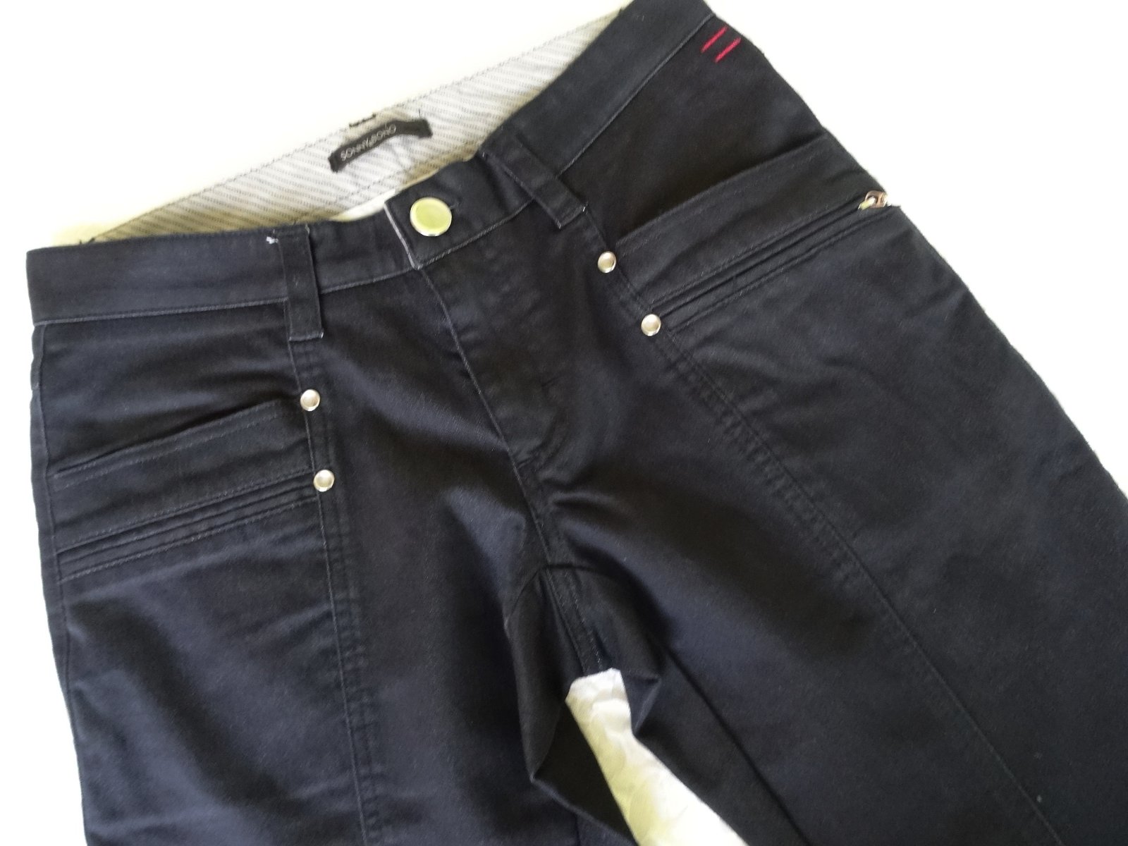 Dámske nohavice rovného strihu - Italská značka Sonny Bono, farba je antracitová, skoro čierna. Veľ.40/M, rozmery: bočná dĺžka 100cm, od rozkroku 80cm, pás 2x39cm. Stehno 10cm pod rozkrokom je 26cm, v oblasti kolena 20 a celkom dole 18,5cm. Nohavice sú kvalitné, pekne šité - dvojité vrecká.