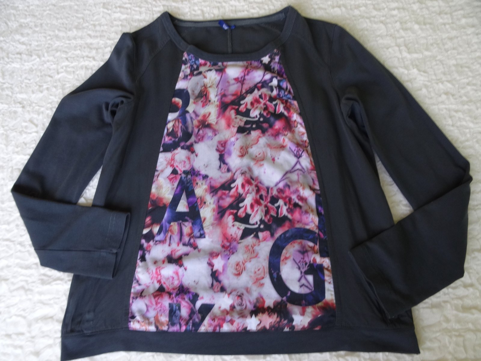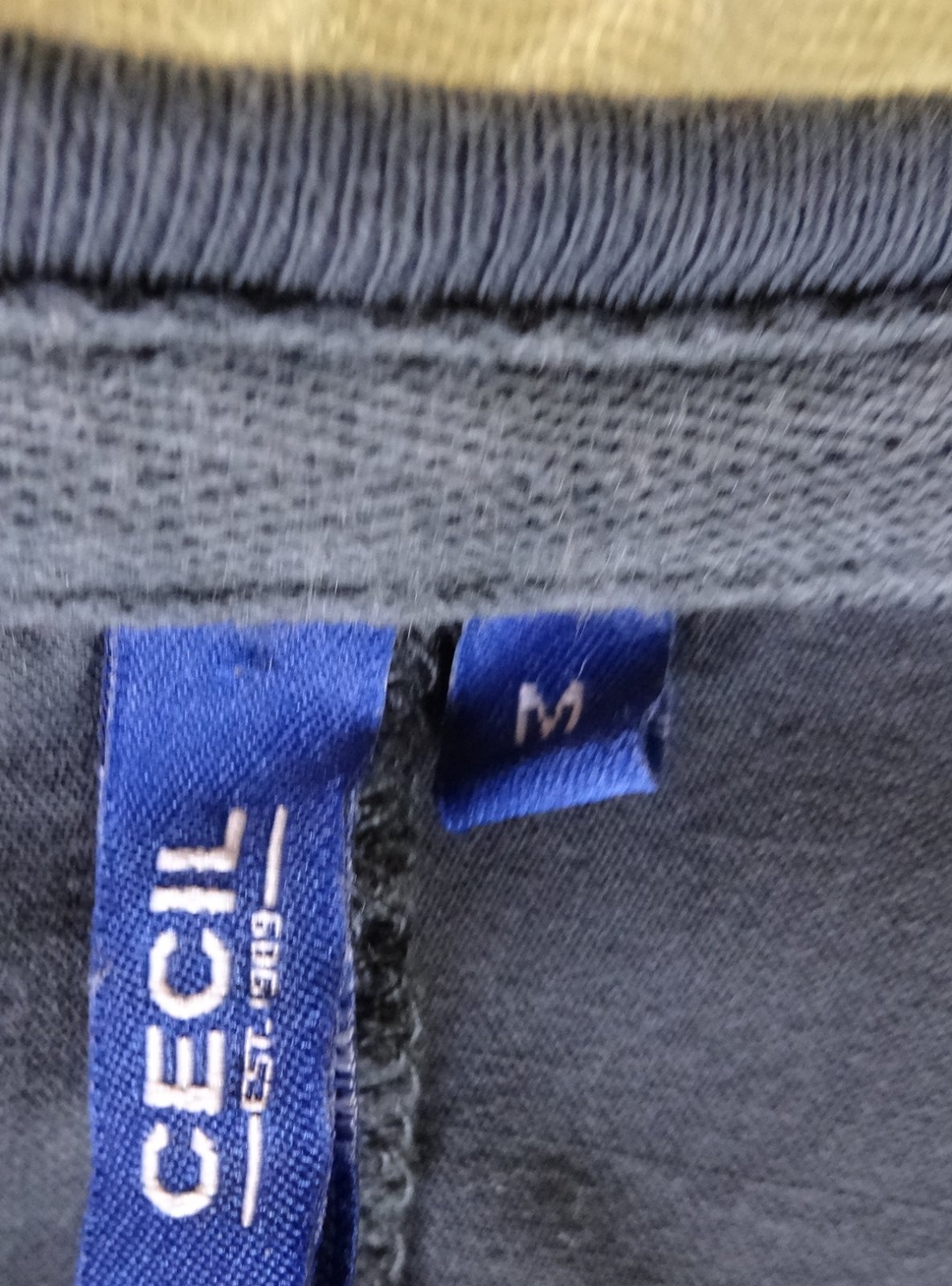 2/ Bavlnený top Cecil s farebnou aplikáciou na prednom diele, veľ.M, rozmery: dĺžka 62cm, pod pazuchami 2x52cm, rukáv 61/49cm.